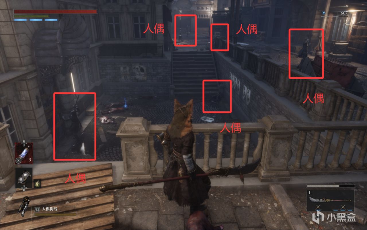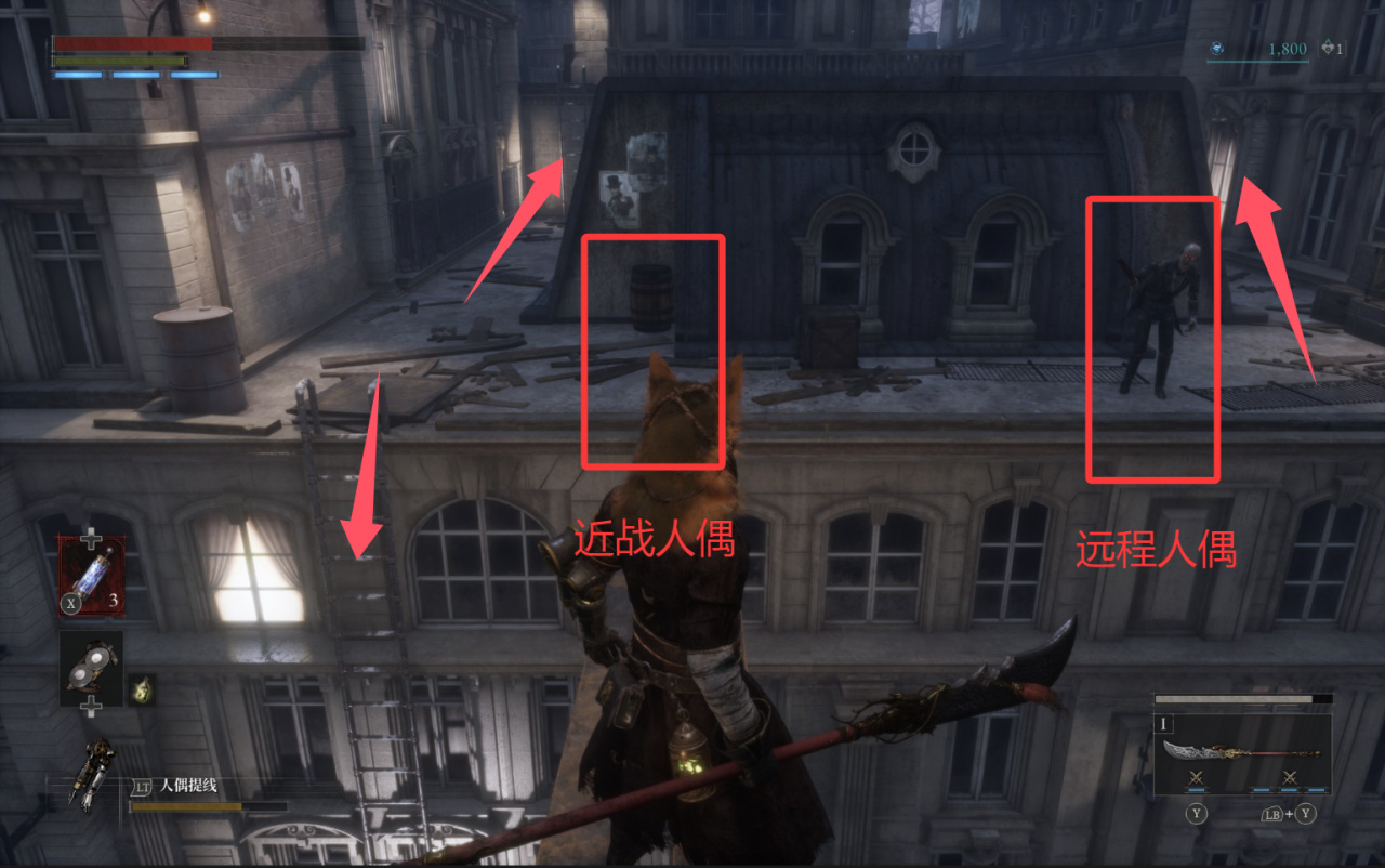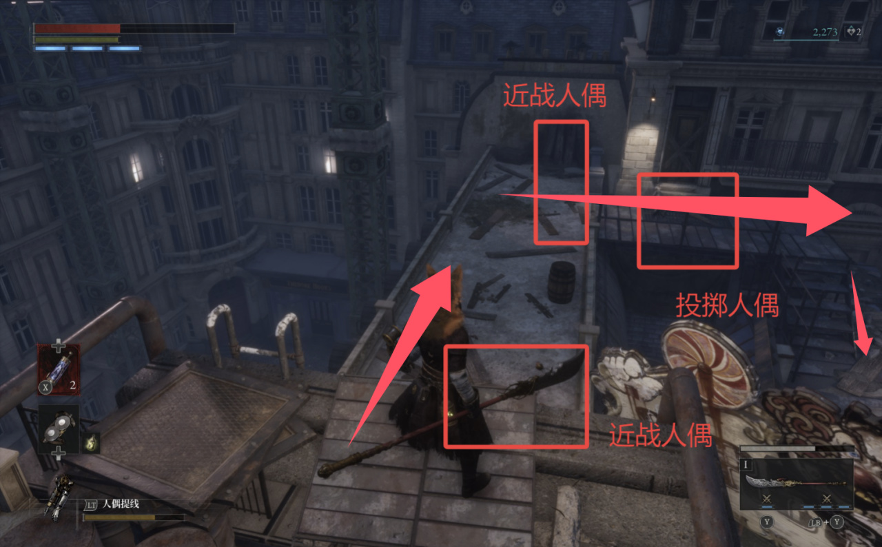 來到如圖所示的位置,需要注意的是高空一直都有投擲敵人,然後左側是一個近戰人偶,右側也同樣有個近戰人偶