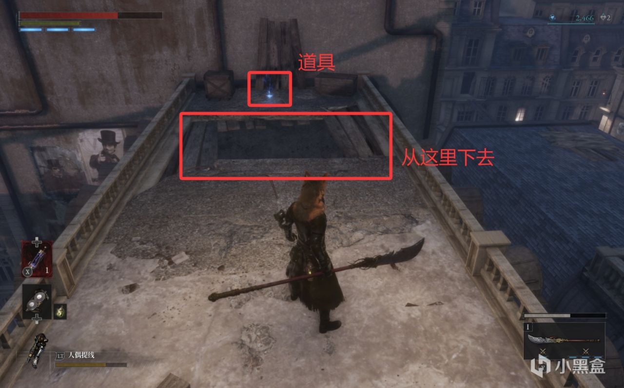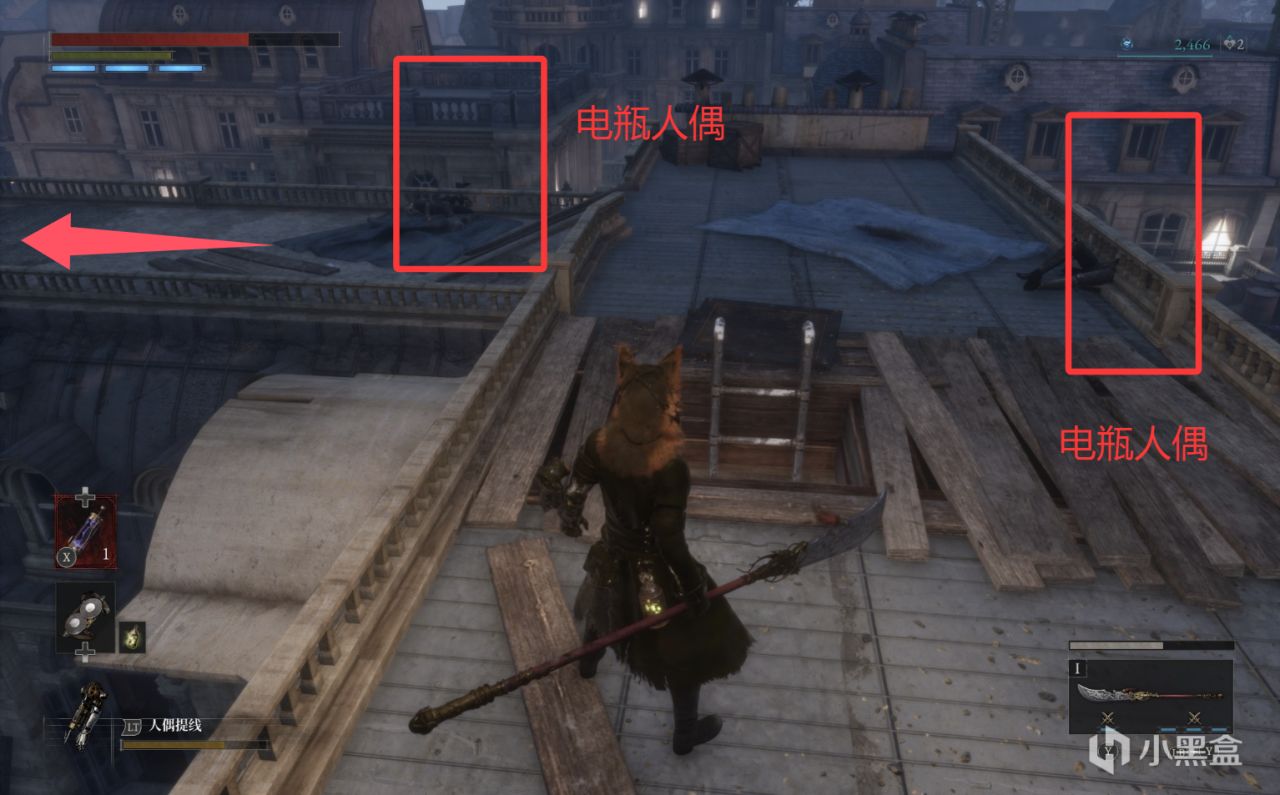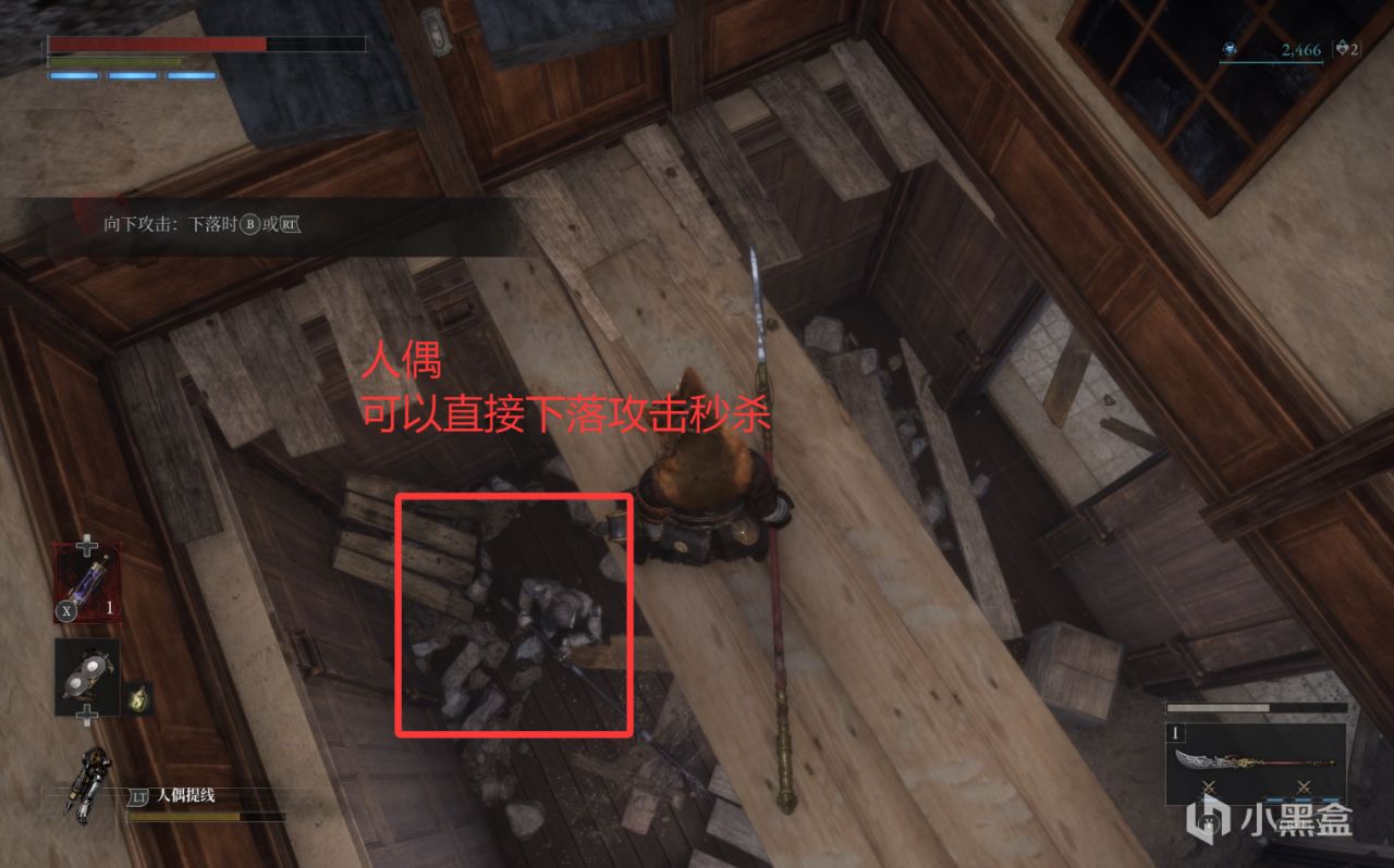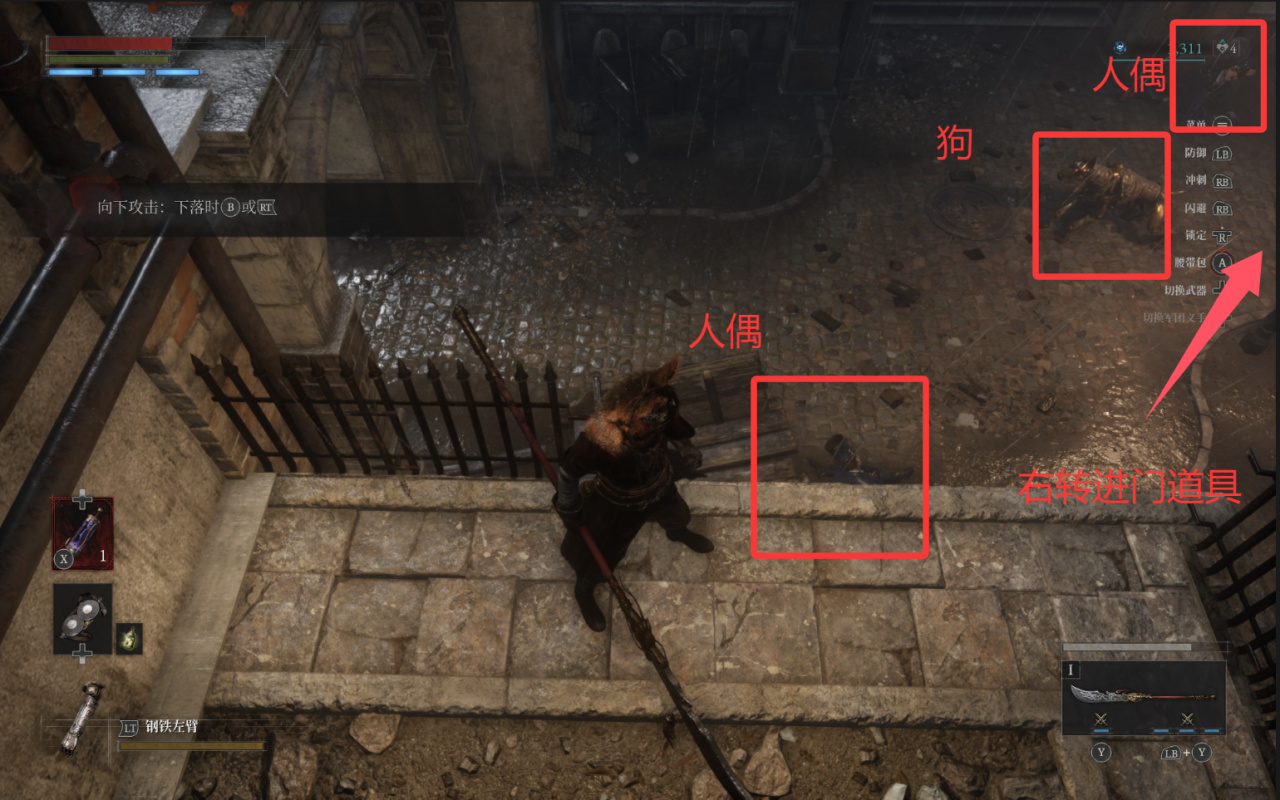 來到如圖所示的位置,需要注意的是高空一直都有投擲敵人,然後左側是一個近戰人偶,右側也同樣有個近戰人偶