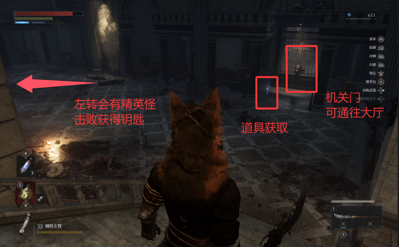 拿完道具之後出門即可看見下行樓梯,從樓梯下來之後將會看到如圖所示,左側會有一個精英怪擊敗之後將會獲得開啓大門的鑰匙,屬於必須擊敗的敵人,擊敗之後拿完鑰匙即可通過正前方的門回到大廳推開主線劇情門