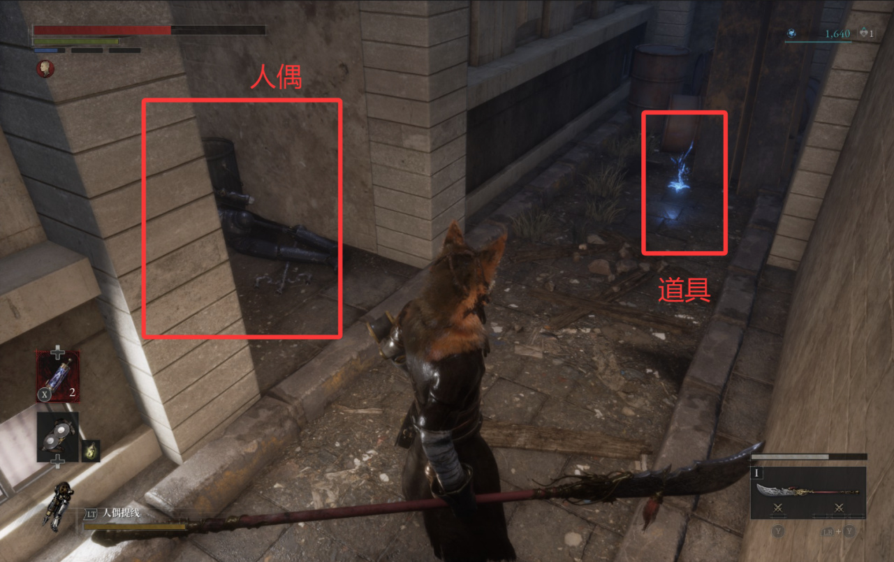 擊敗對應敵人之後先來到右側把道具收集一下,需要注意的是我標記處會有個老六人偶藏在後面等待着給我們致命一擊