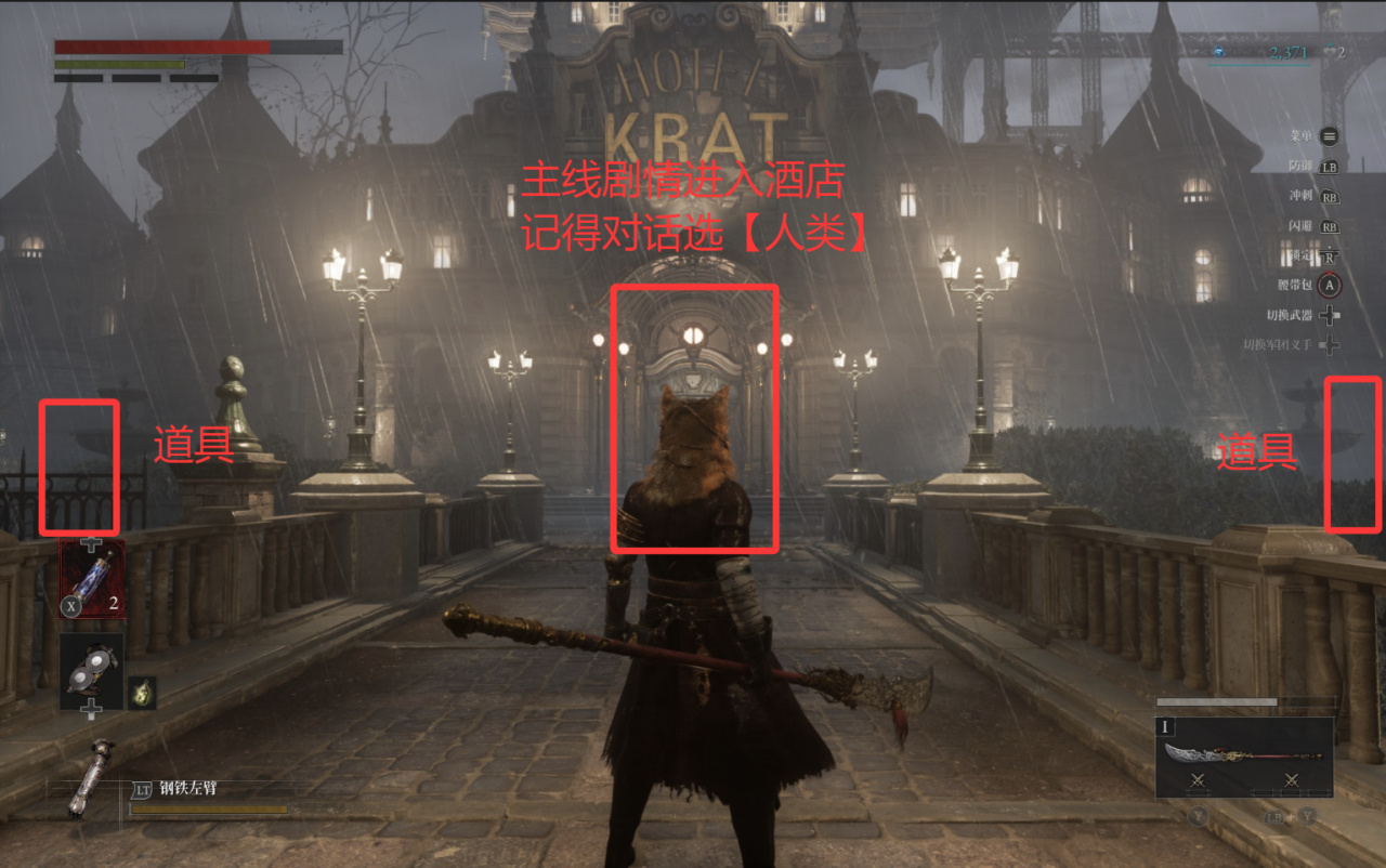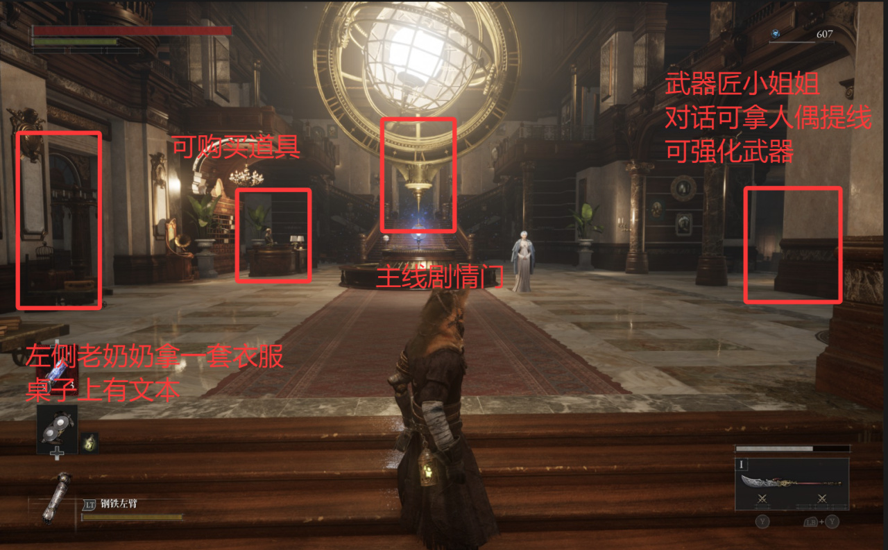 咱們也是終於來到酒店,見到一直引導我們的大妹子。酒店目前二樓是沒有任何東西,一樓可以交互的內容已在圖中進行標註,建議是和老奶奶對話把衣服拿了並且去武器匠那裏獲得手臂,之後便可直接前往主線劇情,對了,右側門可以和訓練人偶戰鬥