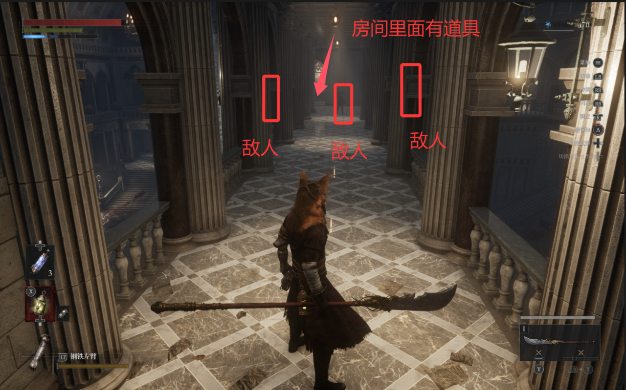 進入房間之後敵人以及道具均已經標註在圖中,根據自己的節奏逐個擊破以及收集即可,右側門目前無法開啓需要後續從另一個打開
