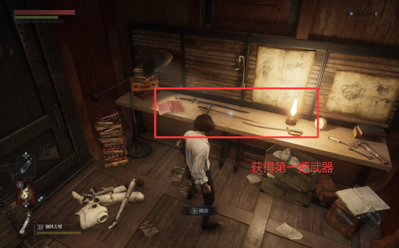 從門口出來之後能夠看到如圖所示工作臺,與之交互能夠從三把初始武器之中選擇一把作爲出門裝,這裏可以隨便選擇後續可以獲得其他兩把並且大多數時間都是使用的關刀,拿完以後我們右轉視角打開車廂門即可離開