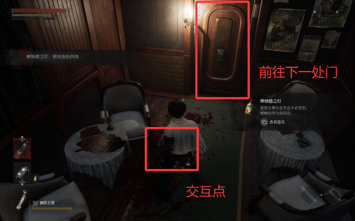 一路走到底便會來到如圖所示的這個位置,地圖標記處有可交互點能夠知曉基礎道具欄的操作以及獲取【摩納德之燈】,拾取完成之後便可推開如圖所示的門繼續前進