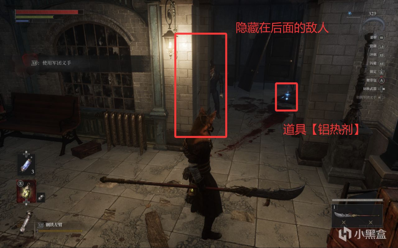 進入門後能夠發現其中有小房間,但請注意房間左側牆後藏有一個人偶,將其擊敗之後能夠拿到道具【鋁熱劑】