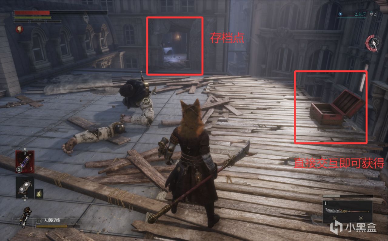 擊敗精英怪之後,能夠在右側打開寶箱拿到道具,同時正前方是下一個存檔點