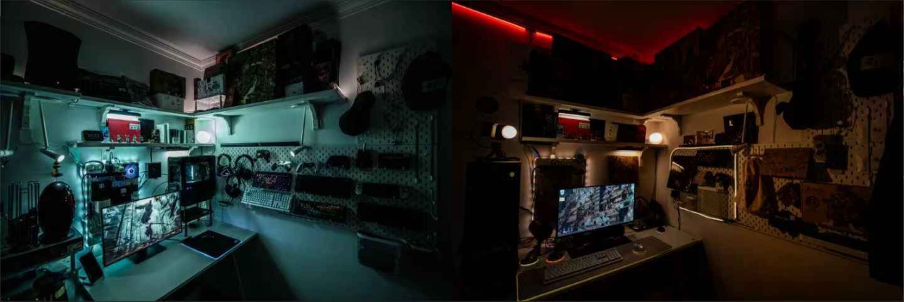 燈光是買完主機以後決定搭建的,主要是當時創業效益還可以,就想追加一下沉浸體驗。最主要研究的就是能實現顯示器的辨色燈光,讓全屋光線和遊戲畫面實現同步。在這裏花了一些冤枉錢,只能說現在市場上很多解決方案只是看起來很美(點名批評小米)。最後主燈光選的飛利浦HUE系列,其他外設用的雷蛇。