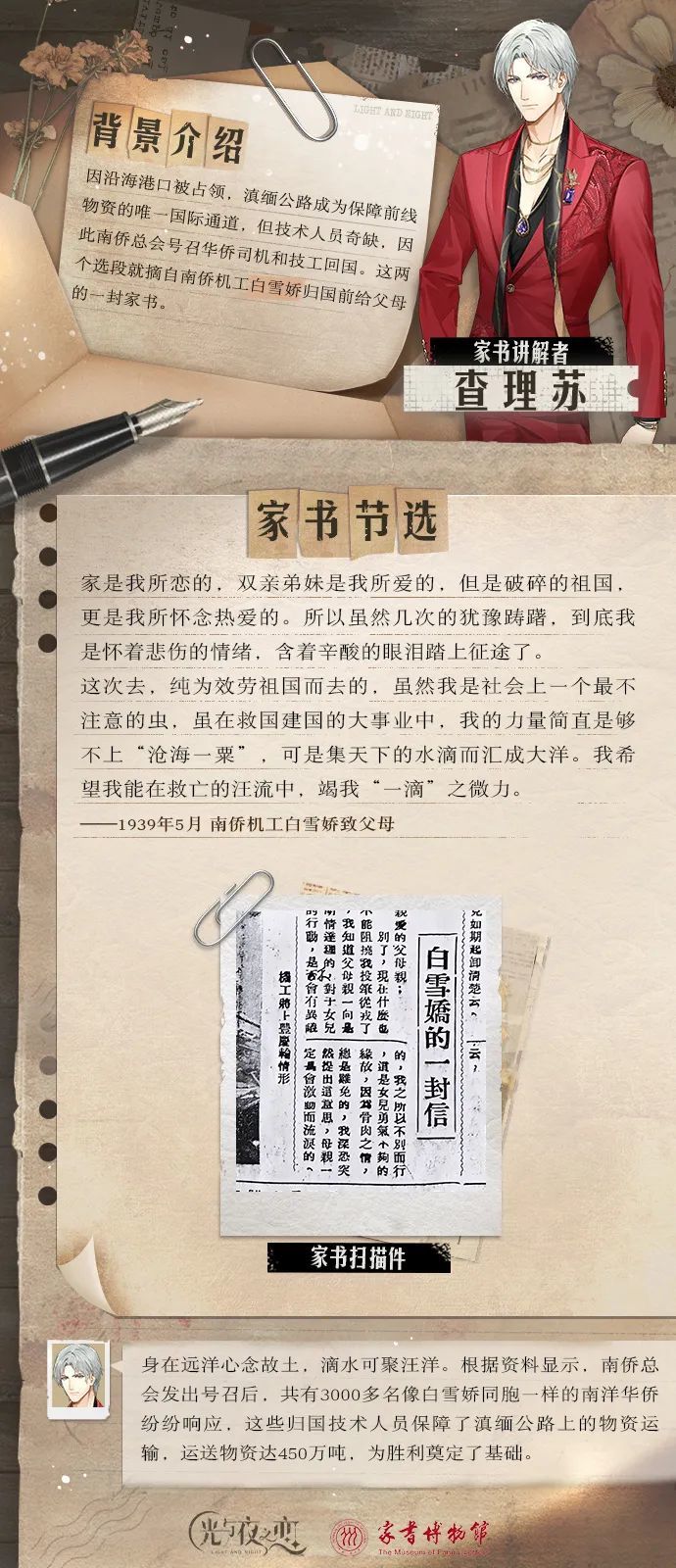 對於國人來說,這種珍愛和平、交接反侵略火種的感受,其實相當好代入和理解,畢竟列強的的確確踐踏過我們生活的土地。在卡池之外,《光夜》也與中國人民大學家書博物館合作,向玩家展示了反侵略時期的部分家書內容。