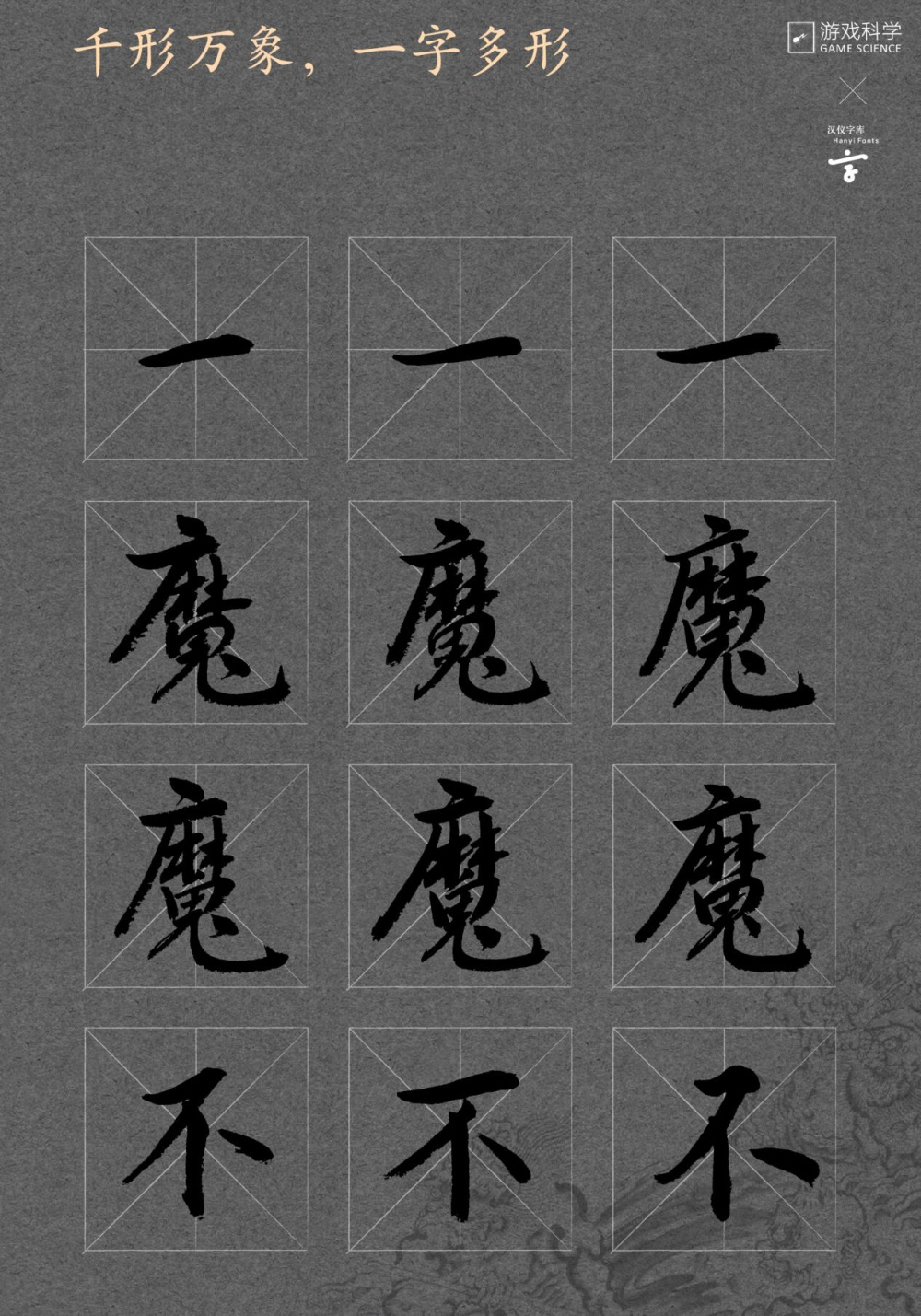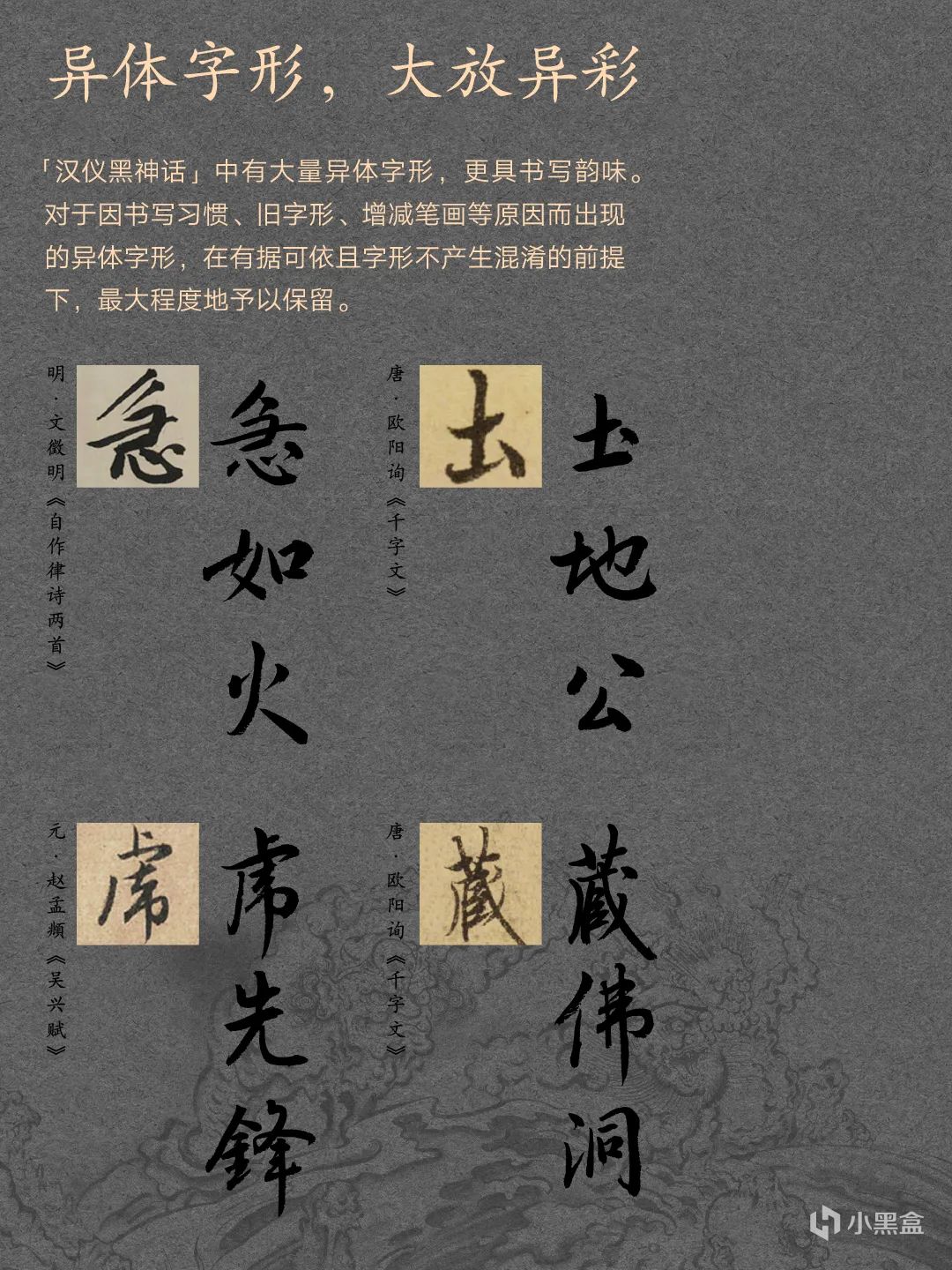 “漢儀黑神話”字體在設計中,更多的保留了書寫細節,其中有大量異體字形,更具書寫韻味。對於因書寫習慣、舊字形、增減筆畫等原因而出現的異體字形,在有據可依且字形不產生混淆的前提下,最大程度地予以保留。