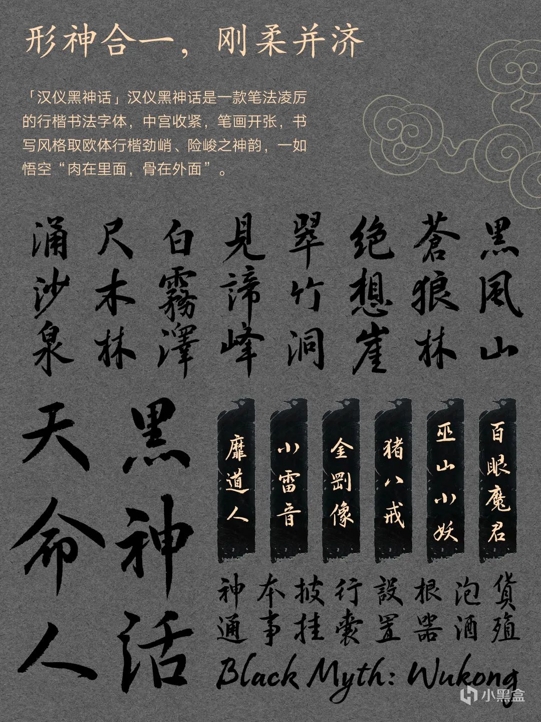 “漢儀黑神話”整體字形取自行楷書法,筆法凌厲,字體中宮收緊,筆畫開張,書寫風格取歐體行楷勁峭、險峻之神韻,一如悟空“肉在裏面,骨在外面”,貼合整體遊戲風格;在BOSS銘牌、章節介紹中,字體的出現或險峻,或平緩,猶如一本緩緩鋪開的古籍善本,讓人沉浸其中。