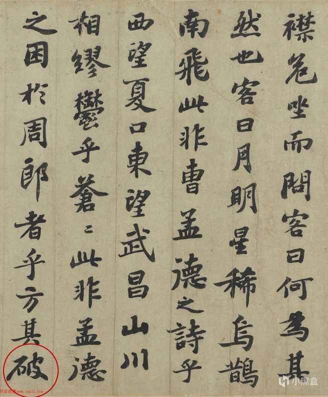 此作切筆而入,行筆紮實有力,長橫越行越重,收筆時頓筆回彈而出,尖入鈍出、提按分明。筆畫主次分明,橫長豎短,豎畫短小精悍,首尾凝重。撇畫、捺畫筆勢舒展,向左右外拓,勾挑含蓄自然。轉折處方折、圓轉並用,既有頓挫剛健感,又有婉轉內斂之美,險絕奇宕,體現了“歐楷”的經典風貌。