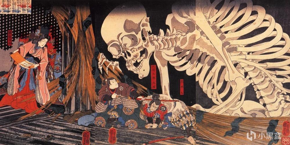2、餓者髑髏,又稱“荒骷髏“,這個妖怪傳說是:戰場上戰死的人,因爲屍骨沒人掩埋,所以這片區域上冤魂的怨念匯聚而化作了巨大的骸骨形態,會出現在深夜裏,見到人就會抓起來喫掉。