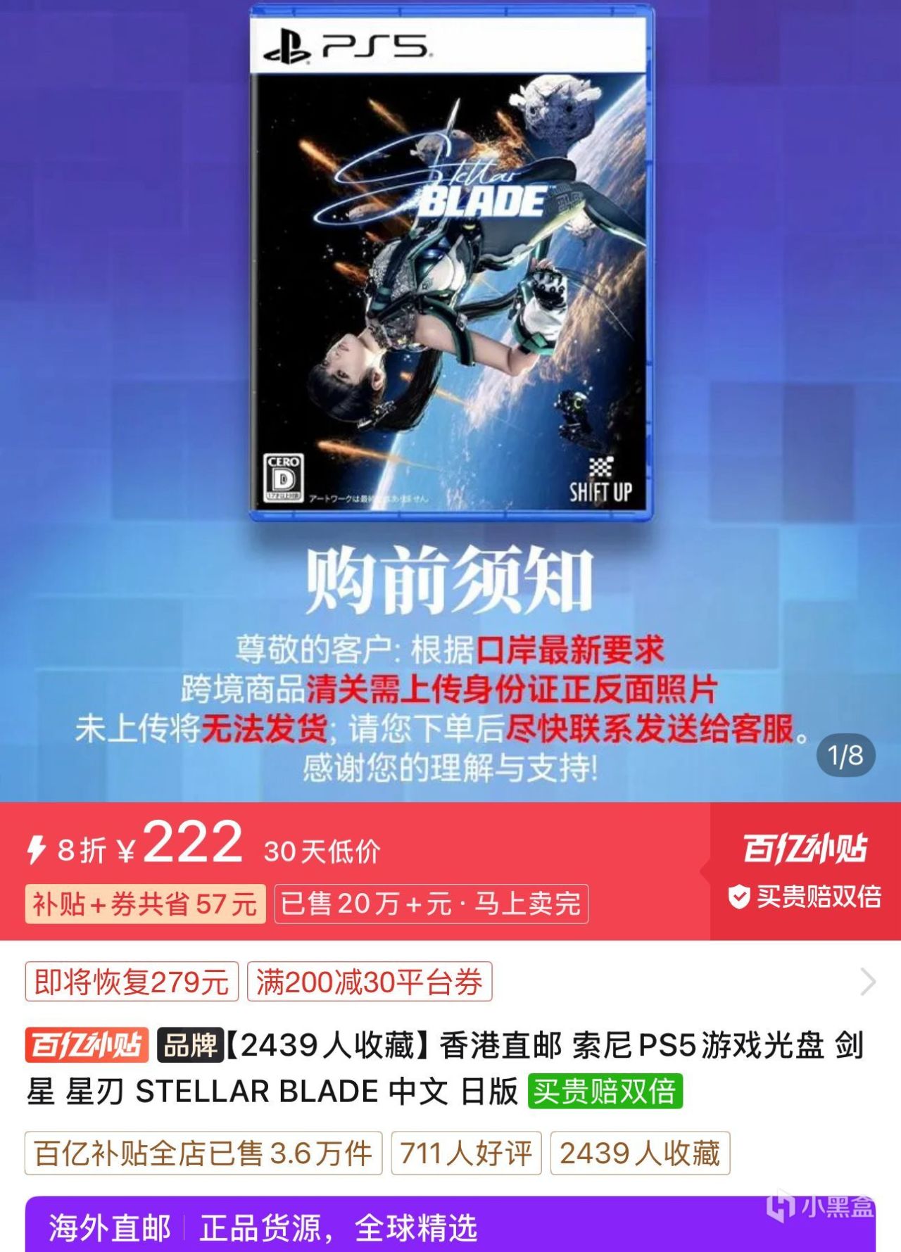 3.PS5《劍星》日版中文全新222元包郵,該價格用了免費積分兌換的200-30的券。劍星自從登錄PC平臺後,PS5版遊戲就一路下跌,從最先快四百的價格直接腰斬成兩百多,對於PS5日版遊戲封面不感冒的玩家可以入手,至於DLC可以註冊PSN日服賬號綁定PS5機器,切PSN主賬號。例如港服遊玩即可,可能買DLC需要切賬號買PSN日服點卡麻煩一點。