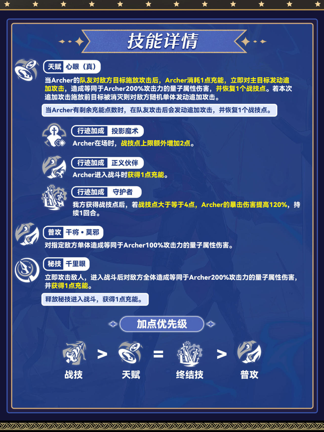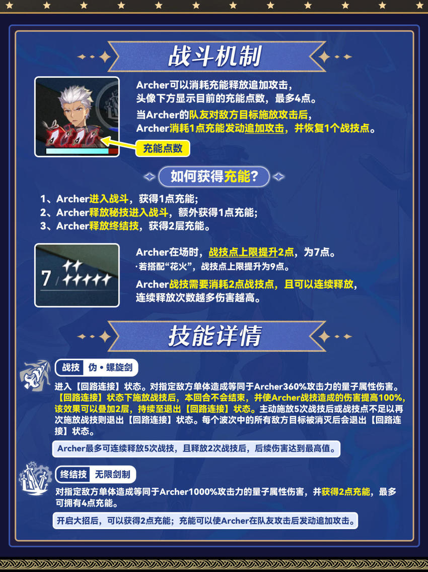 Archer的技能機制非常簡單,主要通過依靠連續釋放戰技對敵方單體造成大量傷害,對戰技點的依賴較大,所以花火是非常適配的隊友。