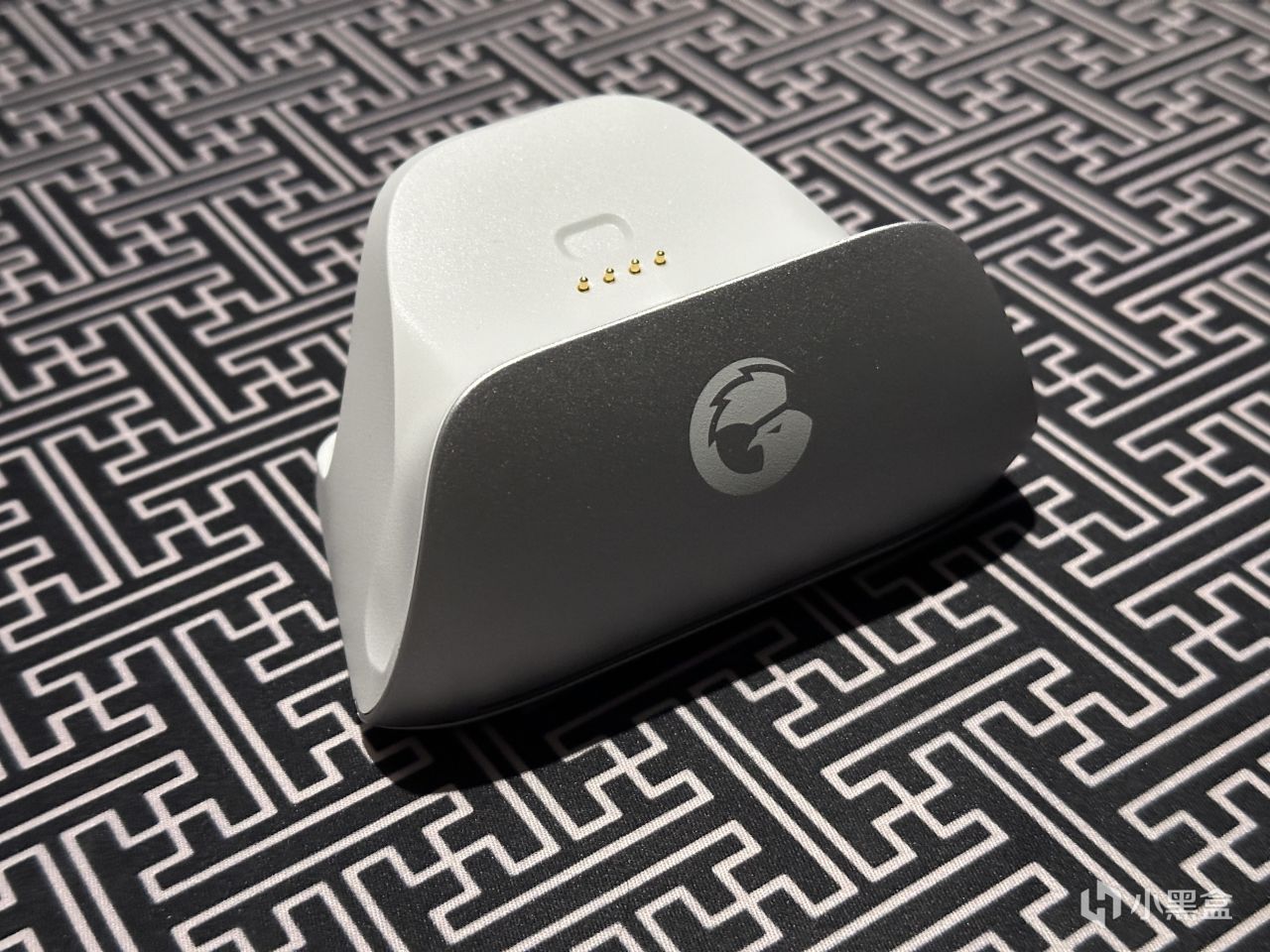 G7pro還標配了充電底座,採用銀白色的設計,正面做了小雞的logo,背面則可以放置G7pro的接收器,平時就可以放桌上當桌搭,並且有智啓停功能,做到即拿即用,即放即充。