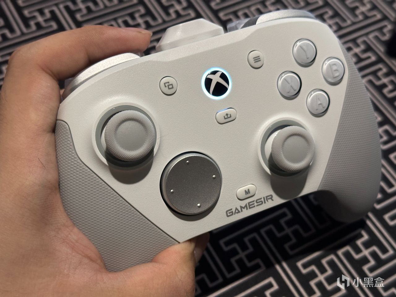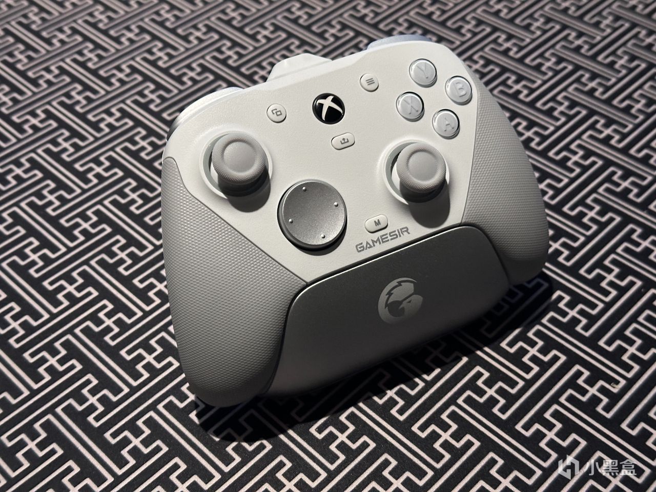 來看到外觀方面,蓋世小雞G7Pro目前只曝光了兩個配色,分別是灰白色和紅黑配色,紅黑色需要等到七八月份與主機款一起上架,所以目前僅有白灰色。整體的白灰色設計還是很有高端的味道的,漆面質感很棒,白色的水晶按鍵更凸顯高端,加上其他按鍵類金屬塗層的設計,半透明的扳機以及中間大大的XBOX西瓜標,整體外觀顏值方面不說驚豔,但絕對是高端、簡約大氣的代名詞。