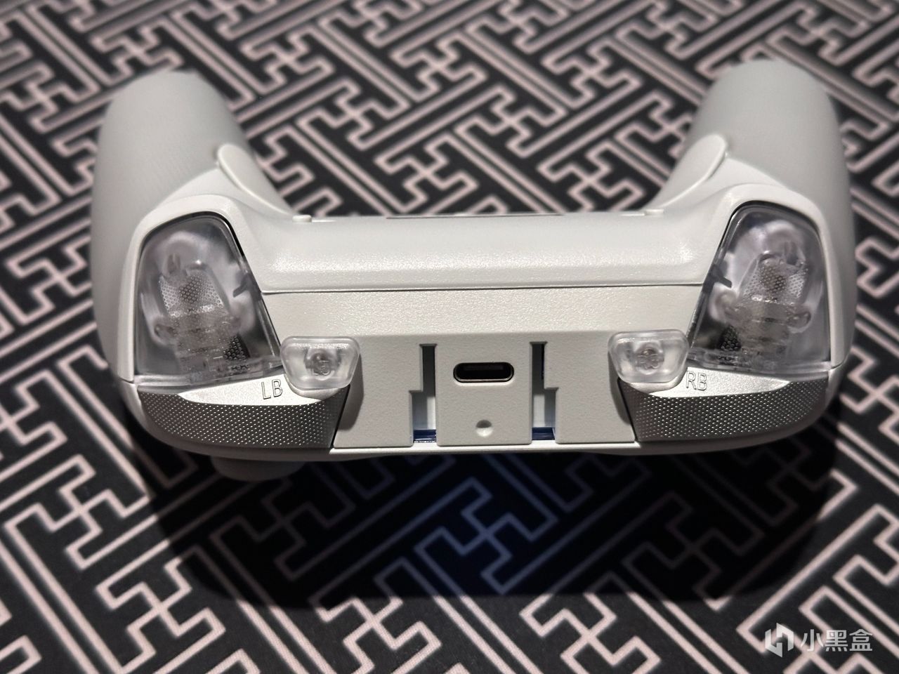 看到手柄的背面,背面做了非常多的設計,首先握把方面採用的是橡膠握把,菱形防滑紋路,握持手感很棒,在握把處可以看到兩個大背鍵,符合人體工學,觸發很方便,並且可以通過背鍵鎖進行切換,防止誤觸,背鍵鎖中間則是各種連接方式的切換以及金屬觸點,上方則有兩個扳機鎖。