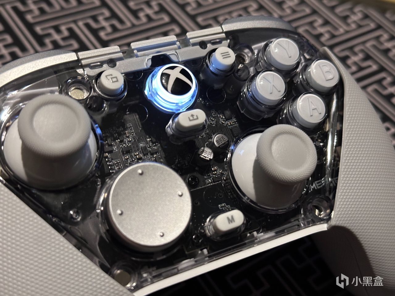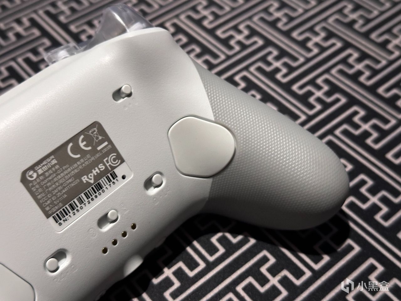 最後就是搖桿部分了,G7pro搭載的是TMR搖桿,也是目前全球首款微軟XBOX授權配備TMR搖桿的一款手柄了,TMR搖桿擁有霍爾更強的壽命以及更接近碳膜的精度,長時間使用會比碳膜舒服,並且支持無死區調節,搖桿內部也做了金屬防磨環,搖桿調教的很不錯。