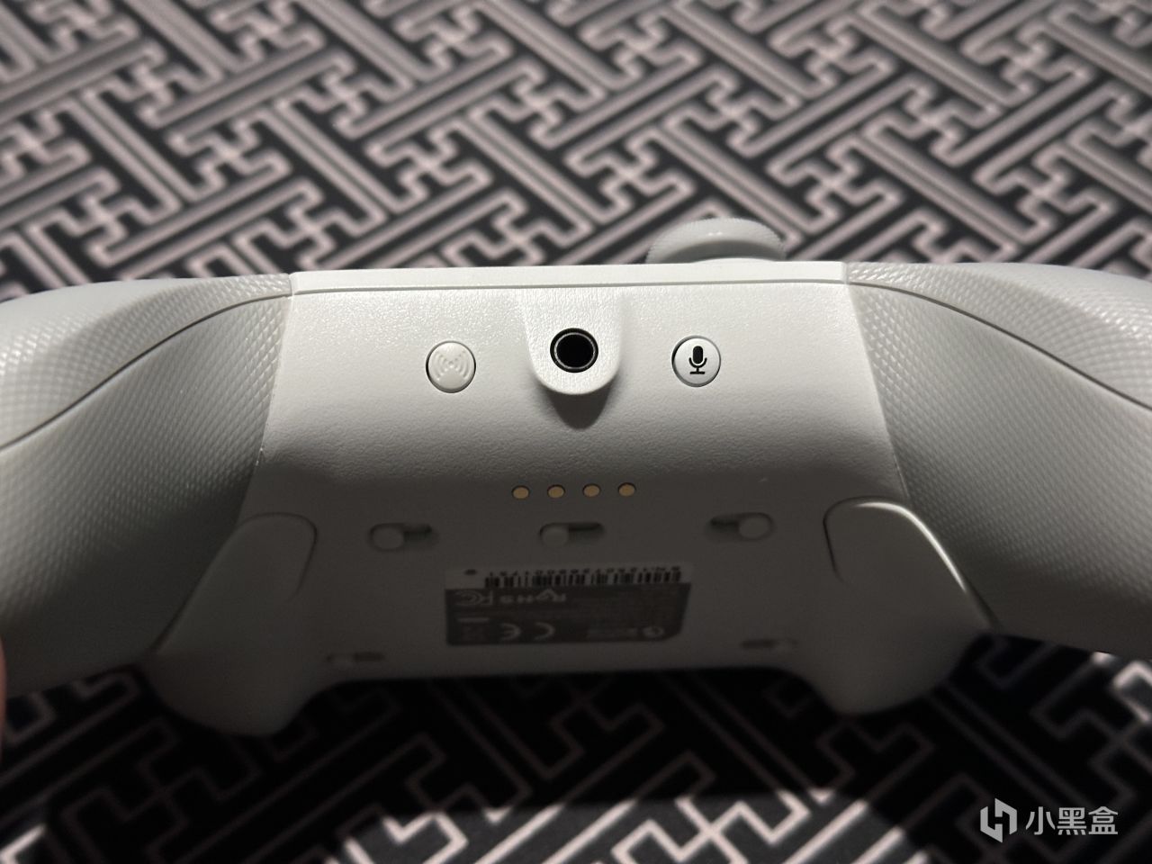 而除此以外,手柄的下方還有一個3.5mm的耳機孔,以及閉麥按鍵,這個設計在xbox手柄中大家都有看到,可以將不夠長的耳機連到手柄上來使用,並且支持麥克風輸入,這個設計還是很好用的,特別是離屏幕比較遠使用手柄的時候。