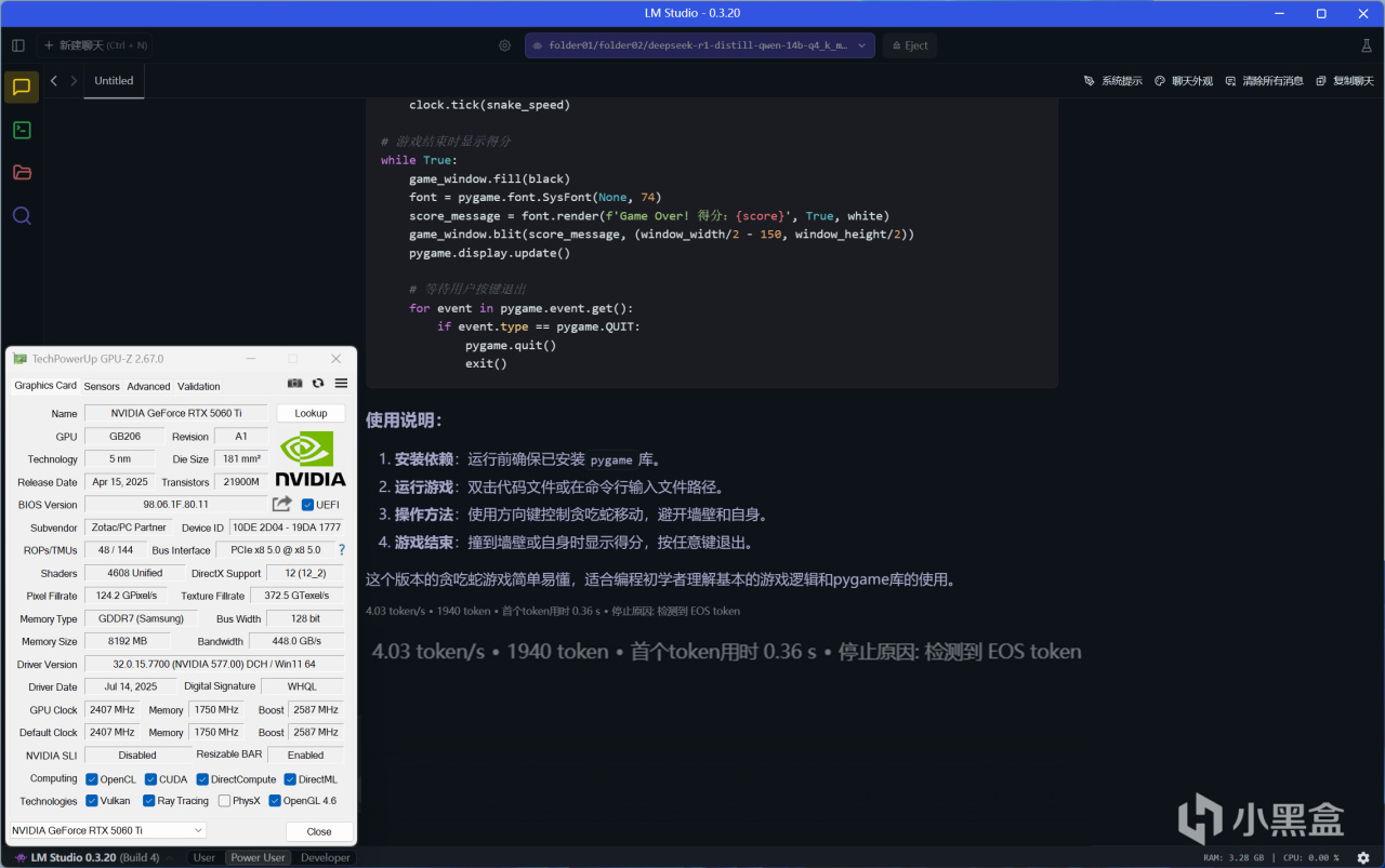 RTX 5060 Ti 8GB使用CUDA 12模式運行DeepSeek R1 Distill Qwen 14B大模型(GPU卸載MAX),推理速度達到4.03 token/s