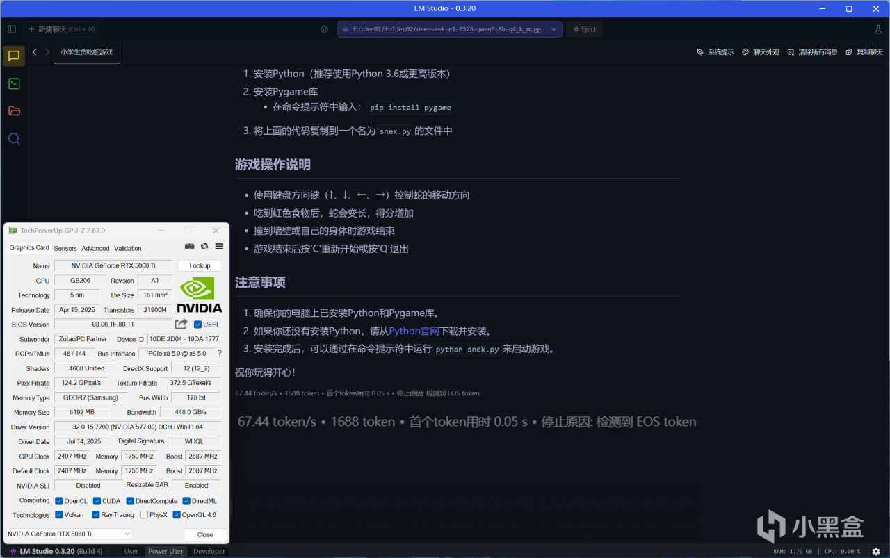RTX 5060 Ti 8GB使用CUDA 12模式運行DeepSeek R1 0528 Qwen3 8B大模型(GPU卸載MAX),推理速度達到67.44 token/s