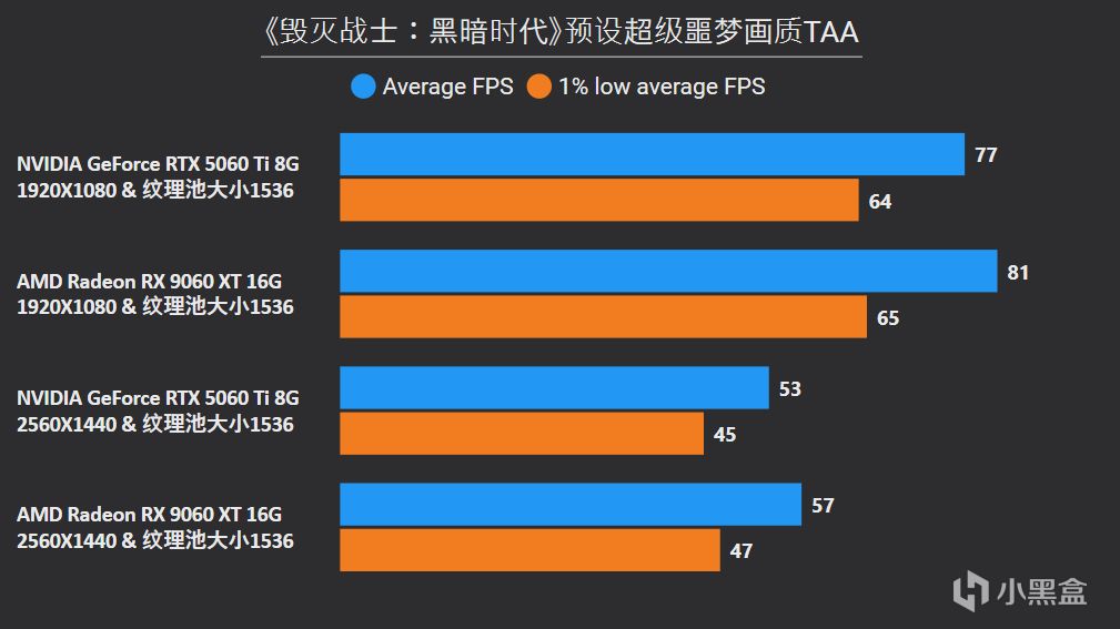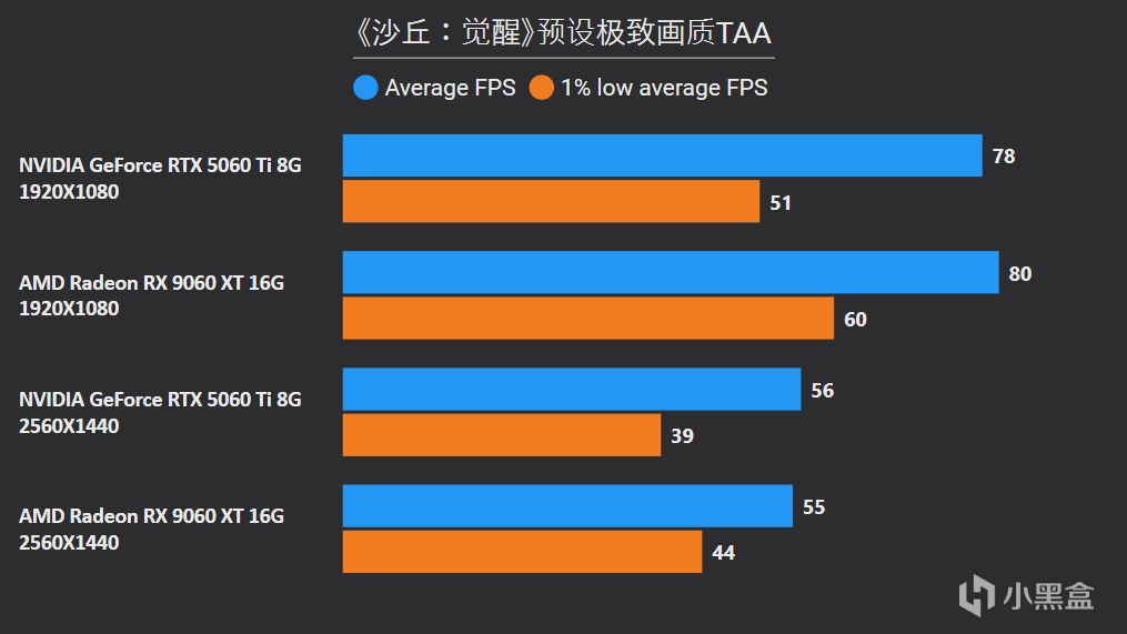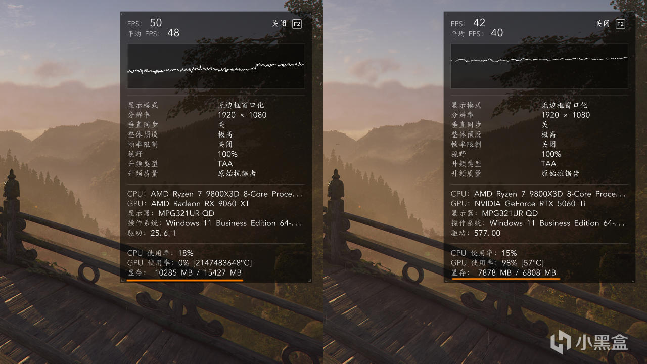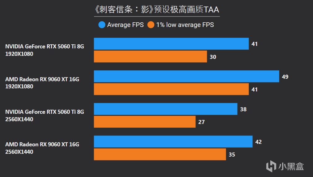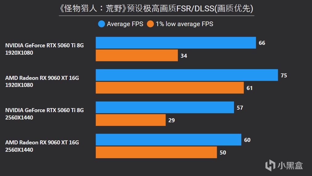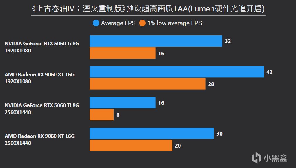 1080P拉滿畫質,大多數3A遊戲8GB顯存尚可一戰,但《刺客信條:影》、《怪物獵人:荒野》和《上古卷軸IV:湮滅重製版》都是爆顯存的,最直接就是反映在1% LOW幀差距上,8GB的RTX 5060 Ti在這三款遊戲中,落後幅度分別達到37%、79%和175%,RX 9060 XT平均幀數和1% LOW幀都能做到領先的有6款遊戲,其餘4款雖落後於N卡,但1% LOW幀不至於崩得那麼誇張,細看幀數還是流暢水平的。