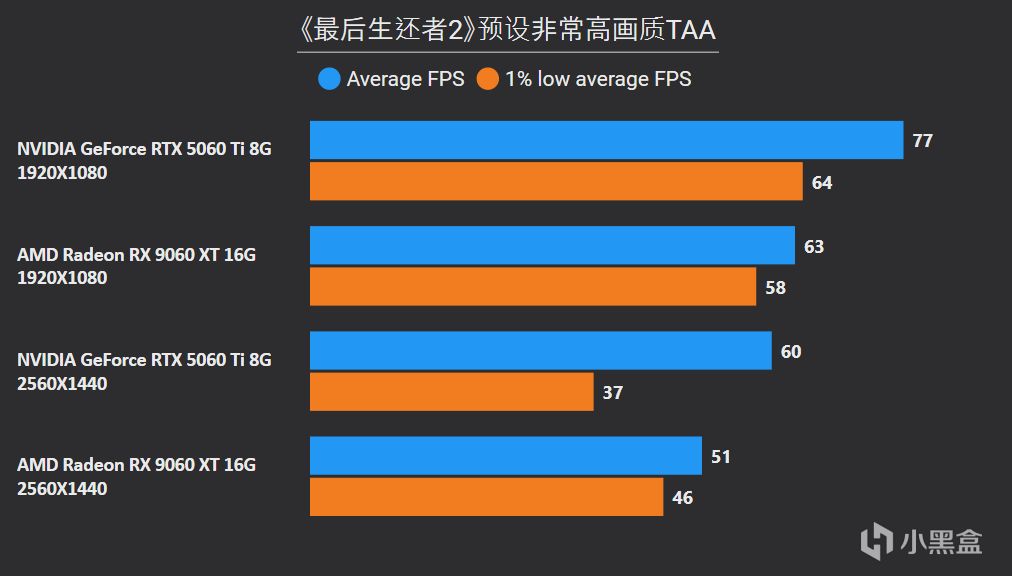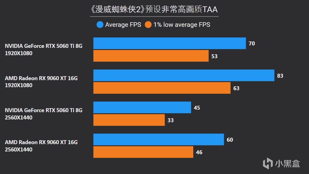 總得來說,1080P分辨率下RX 9060 XT 16GB平均幀可領先1%,1% LOW幀領先28%,而2K分辨率RX 9060 XT 16GB平均幀領先18%,1% LOW幀則是誇張的60%領先幅度,直接反映的就是8GB顯存崩盤,卡頓現象頻繁。