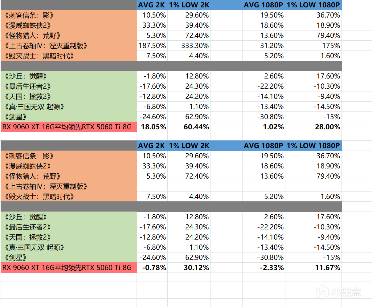 具體到顯卡方面,本文測試的RX 9060 XT 16GB和RTX 5060 Ti 8GB,硬核也做了一個性能統計表格: