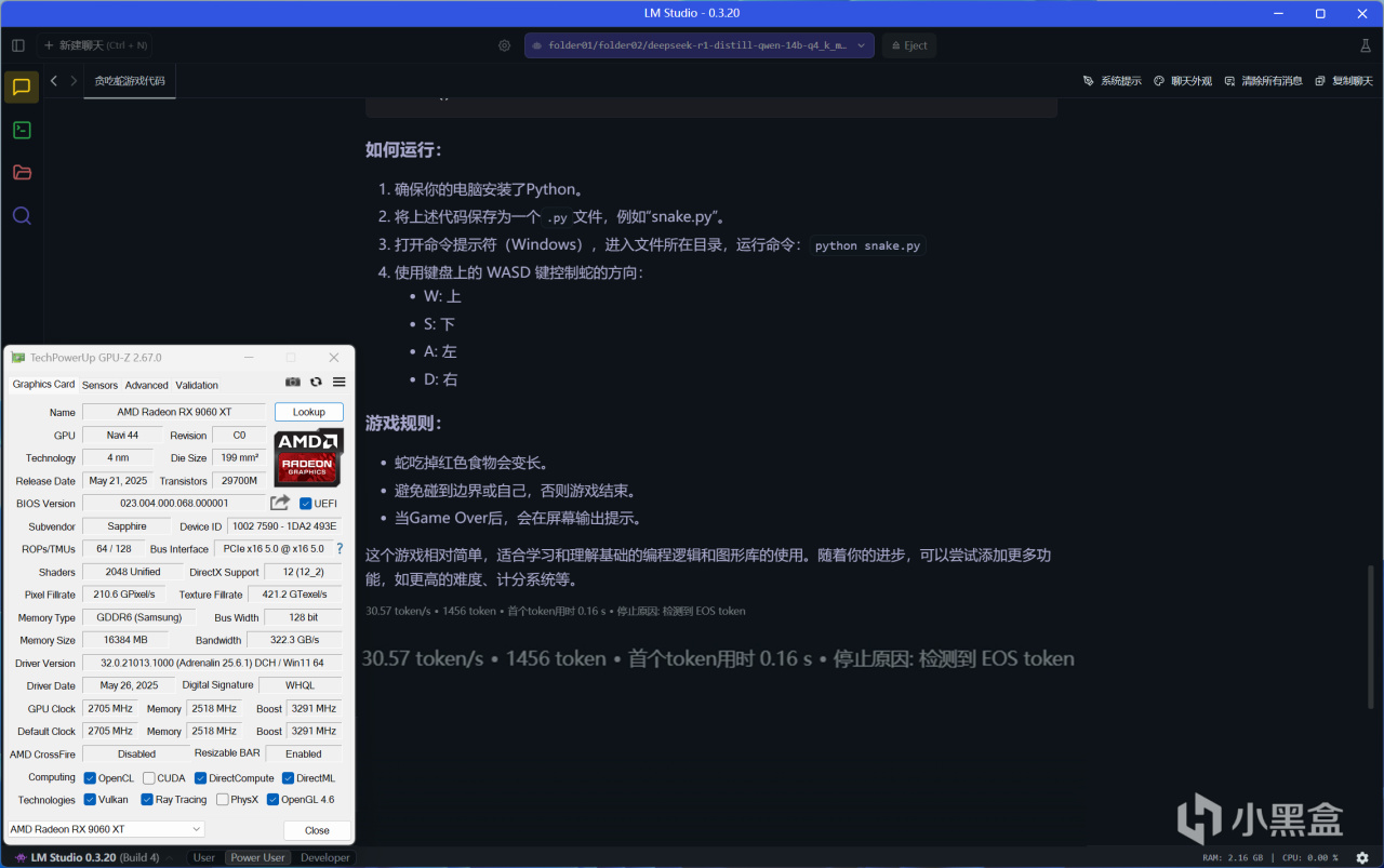 RX 9060 XT 16GB使用Vulkan模式運行DeepSeek R1 Distill Qwen 14B大模型(GPU卸載MAX),推理速度達到30.57 token/s