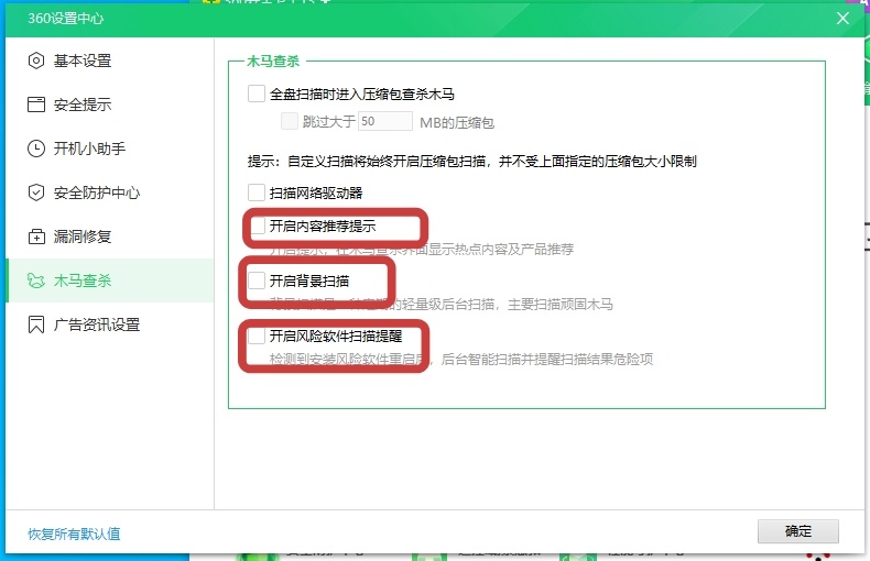 之後找到木馬查殺,將此頁面全部勾選關閉