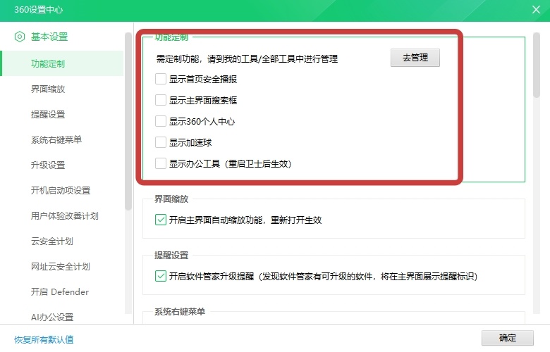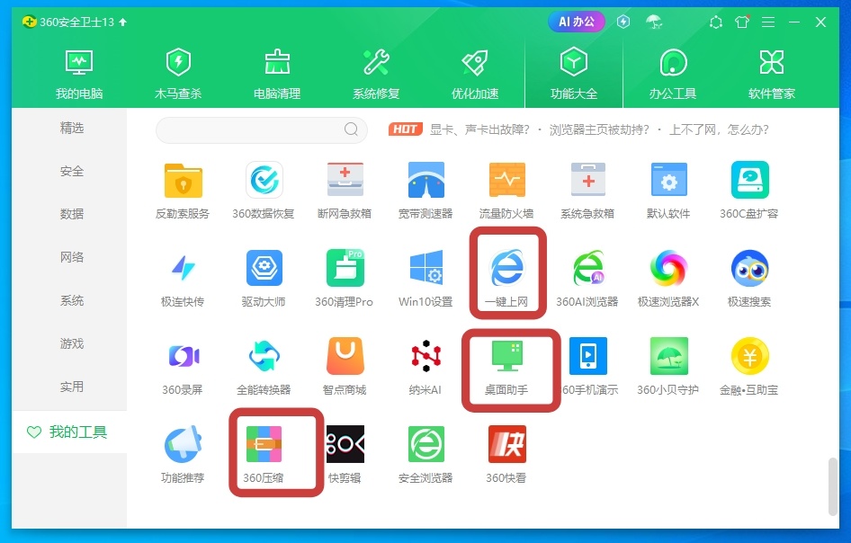 全部好了之後返回首頁打開功能大全,刪除那些不需要的工具,尤其是桌面助手,一鍵上網,360壓縮
