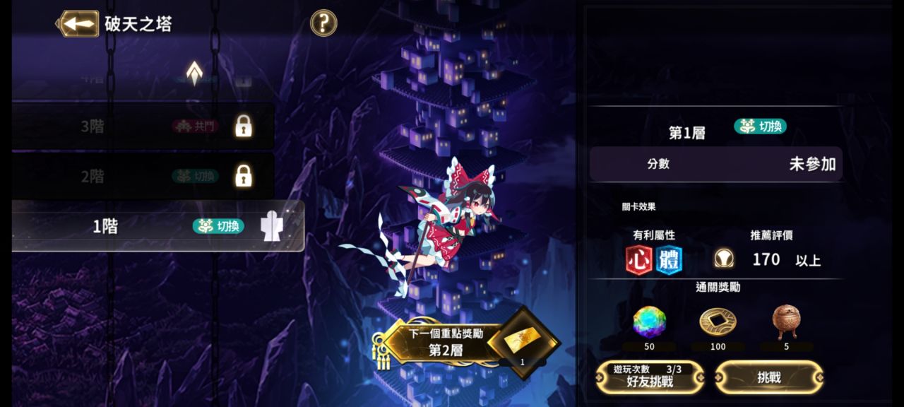 除此之外,遊戲內還設有爬塔玩法——【破天之塔】:隨着樓層的逐步推進,難度也會逐漸增加。通關第30層後,玩家將獲得角色必定券,能夠直接獲取主角,無需通過抽卡獲得(該模式同樣可以藉助好友的力量共同挑戰)。