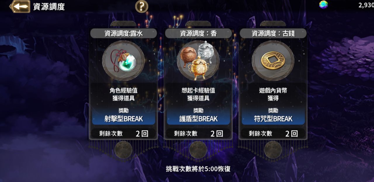 這時可以進入【資源調度】模式來刷取資源,同時還能解鎖不同類型的BREAK。