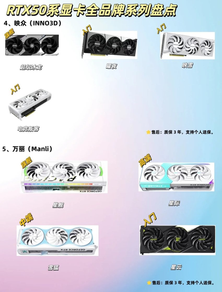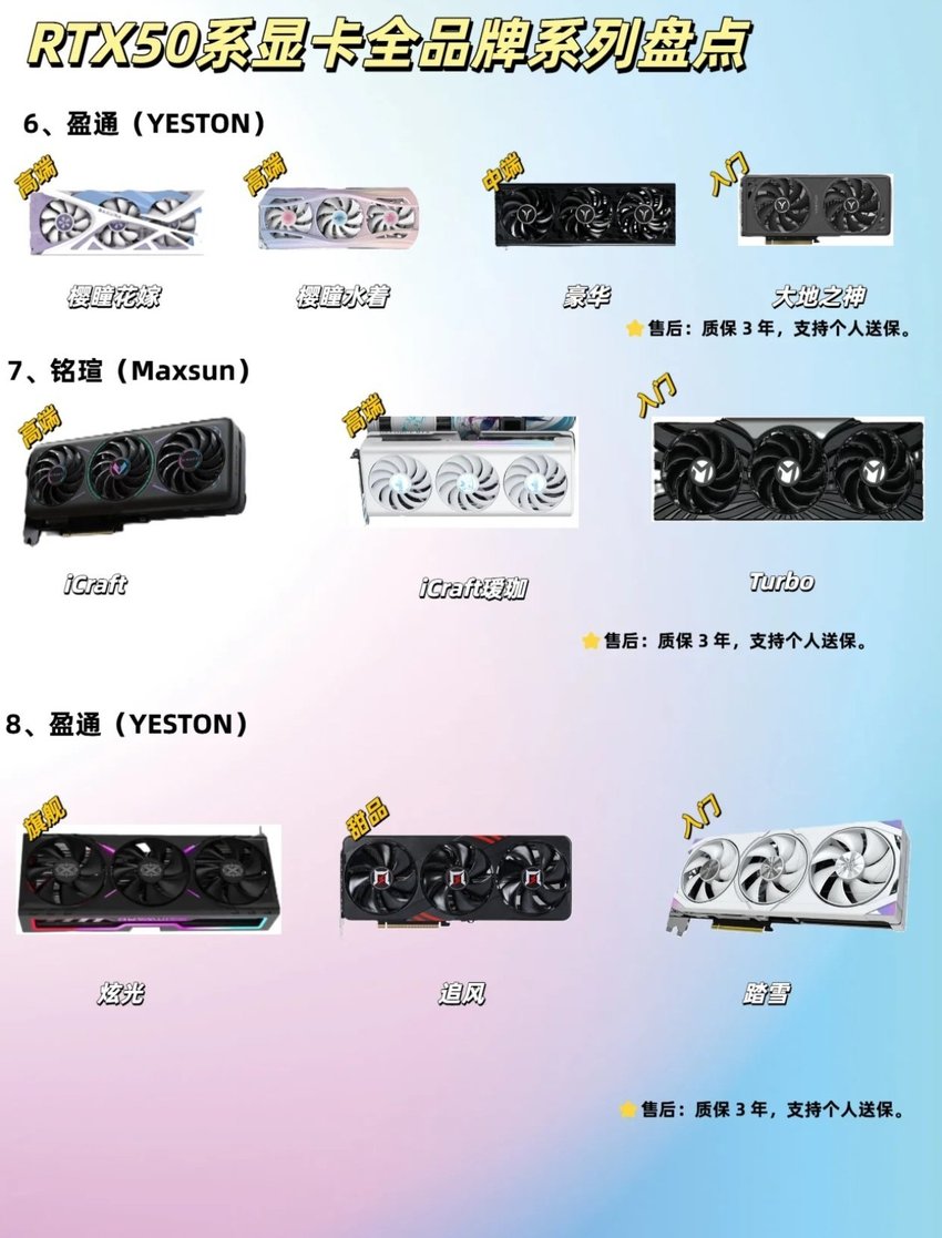 剩下的裏面,影馳、索泰、映衆、耕升、銘瑄屬於二線,價格和性能平衡得不錯,追求性價比的話可以看這些。三線就是盈通、萬麗、翔升,價格更便宜,但細節做工和售後覆蓋會弱一些。