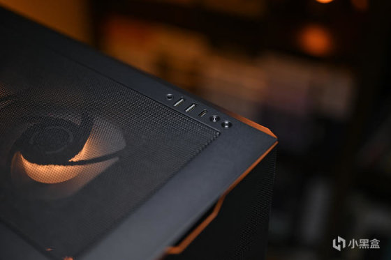 機箱前置 I/O 設計在機箱頂部右前側,從上到下分別爲:1x3.5mm 多功能音頻接口、 2xUSB3.1 Type-A 接口,1xUSB3.2 Gen2 Type-C 接口,2x燈光控制按鍵。