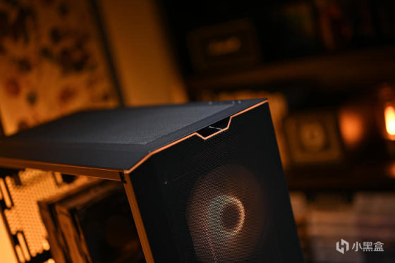 最上方是開關機鍵,倒置梯形設計,並帶有雙無限環紋理。機箱頂板和前面板交匯處 RGB 燈帶燈效,支持主板 ARGB 同步。
