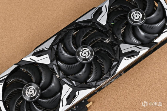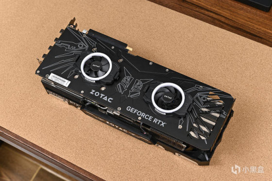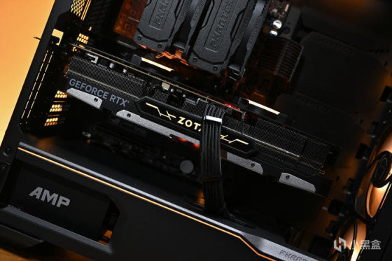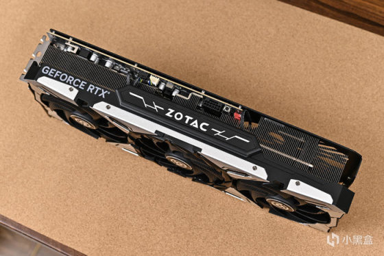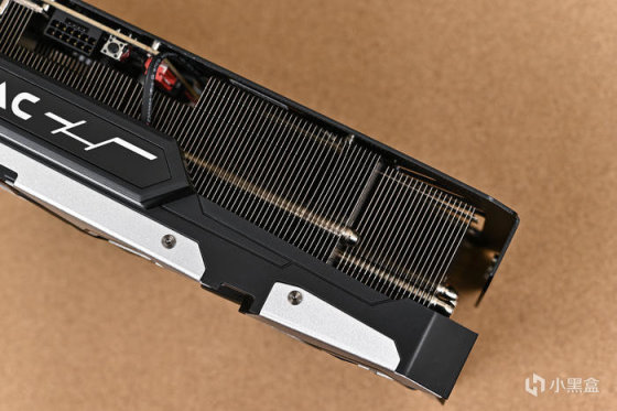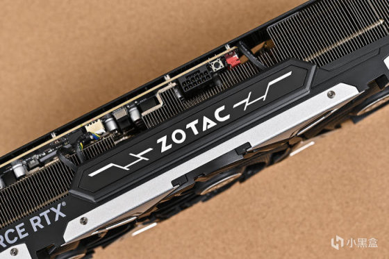 側邊中間的 ZOTAC Logo ,爲鏡面半透明呼吸燈,點亮後會有 ARGB 燈效。上方是供電接口,規格爲 1 x 12VHPWR,右側還設有雙 BIOS 切換按鍵,爲玩家提供加速和寂靜兩種風扇控制模式,可在遊戲過程中使用顯卡上的按鈕切換風扇散熱策略。
