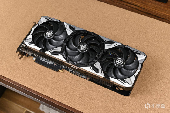 顯卡正面展示。索泰 GeForce RTX 4090 天啓 OC 正面延續了30系天啓的設計元素,採用三風扇設計,顯卡導流罩佈滿了各種幾何紋路和棱角,黑色主色調搭配銀鱗合金甲片,增加顯卡結構強度的同時讓顯卡外觀更加有質感。這款顯卡採用了全新升級的高效冰芯 VC 散熱系統,搭載盾鱗 2.0 仿生扇葉、大面積 VC 均熱板、七根冰脈 2.0 熱管、全覆蓋高密度鍍鎳鰭片,對流穿透散熱設計,能大大提高顯卡散熱效能,釋放核心全部潛能。顯卡整體尺寸爲:376x150x74mm,3.5 槽設計,基於 GeForce RTX 4090 圖形核心設計,配備 S.E.P2.0 供電系統,24+4 相高規格供電,擁有流處理器 16384 個,顯存 24GB GDDR6X,顯存位寬 384-bit,核心頻率 Boost: 2550 MHz,顯存頻率 21 Gbps,功耗 450W。