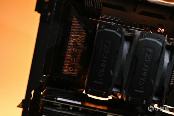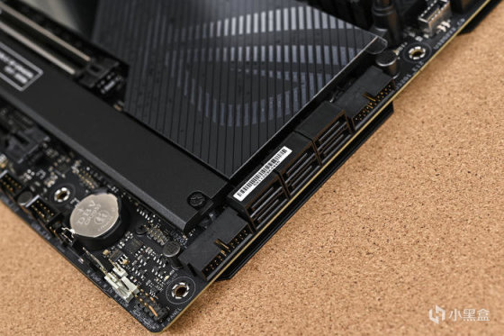 主板下方通體覆蓋大面積厚實的散熱裝甲,PCH 散熱器的外觀銀黑條紋組成的ROG信仰之眼,無 ARGB 燈效,個人更喜歡這樣有金屬質感的無光設計。兩個PCIe5.0 x 16 擴展插槽的表面均有金屬保護罩,提高接口強度的同時還可以避免信號干擾,下方還有一個 PCIe 4.0x16 插槽。第一條 PCIE X 16 支持最高 PCI-E 5.0 X16,第二條 PCIE X 16 支持最高 PCI-E 5.0 X 8 (以上 2 根共享 CPU PCI-E 5.0 X16,提供 X16/X0 或 X8/X8 的組合),最下方PCIE x16 實際爲 PCI-E 4.0 X8 的通道,方便支持 ROG HYPER M.2 CARD 上的雙 PCI-E 4.0 X4 M.2 SSD。