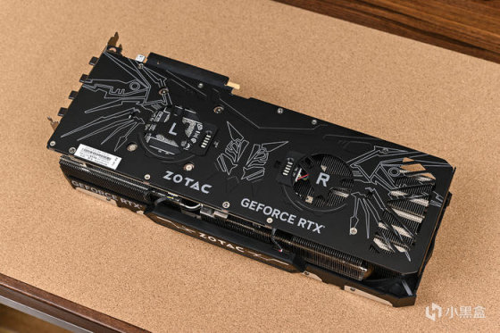 顯卡背面標配金屬背板,採用高強度合金材料一體鑄形而成,增加顯卡結構強度,有效保護PCB,提升顯卡靜電防護能力,同時背板尾部做了大面積開孔,方便正面風扇將鰭片熱量從此處快速排出,提高散熱效率。背板上的雙翼元素源自於天啓姬的鈞天裝甲,在背板設計了兩個卡槽,可以插入包裝內隨附的兩個 RGB 小風扇爲顯卡輔助散熱,下方還印有 ZOTAC 和GEFORCE RTX 字樣。