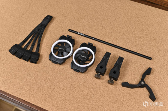 包裝的下層附件方面則附贈了:一對天啓之翼 2.0 散熱引擎風扇,一根一分四的 8pin 轉接線,一套顯卡支架,還有一本說明書和快速安裝指南。