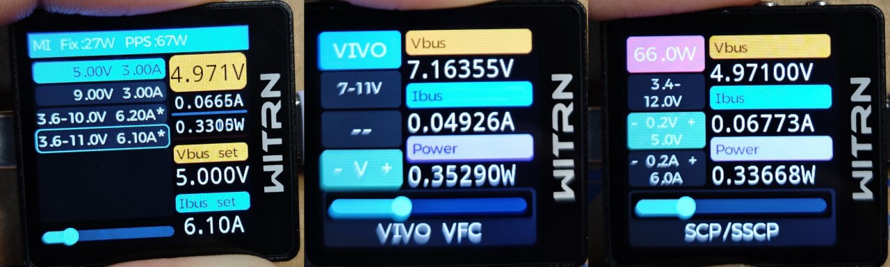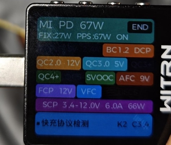 接下來進行私有功率檢測,使用維簡k2測試,小米私有協議最大功率爲67w;vivo私有最大11v,是66w;華爲的scp最大也是66w;oppo私有無法測出。