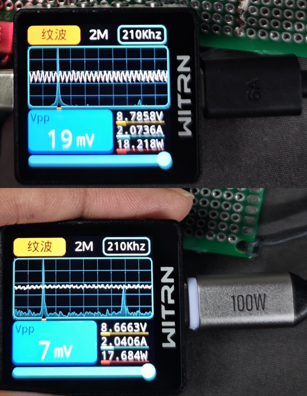 那使用這根線之後紋波會不會被影響呢,我也進行了測試。誘騙一個9v的電壓,可以看到在不使用轉換線紋波爲19mv,而使用轉換線之後紋波到了7mv,說明這根線還有濾波的功能。(測試使用了固定負載)