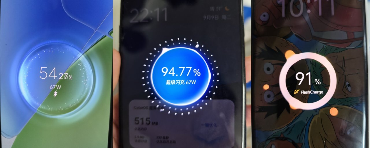 使用手機實測,可以看到小米顯示功率爲67w,oppo顯示67w,vivo顯示flashcharge也已經激活快充,lz沒有搞到榮耀/華爲手機,所以沒有測試。(此oppo手機最高支持67w,不確定是否能激活更高功率快充)