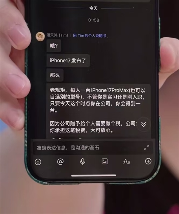 截圖顯示,Tim發佈消息稱:老規矩,每人一臺iPhone 17 Pro Max(也可以自選別的型號),不管你是實習還是剛入職,只要今天這個時點你在公司,你會得到一臺,贈予所需繳納的個稅由公司承擔。