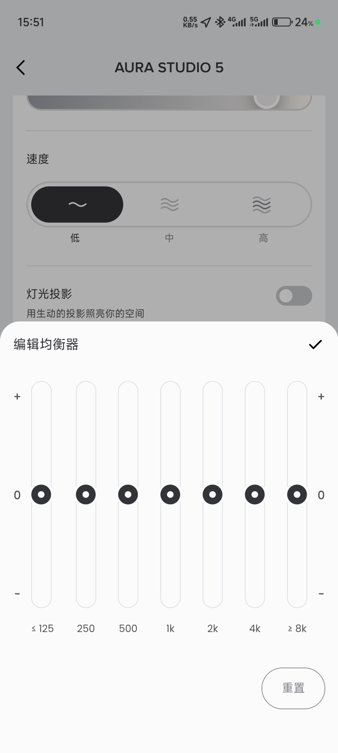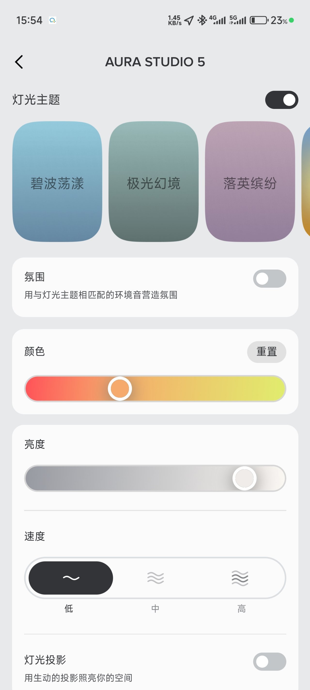本次哈曼卡頓終於把琉璃5列入所謂的智能音響,可以用APP控制了,如圖可以看到可以控制燈效種類,顏色,亮度,動態速度。