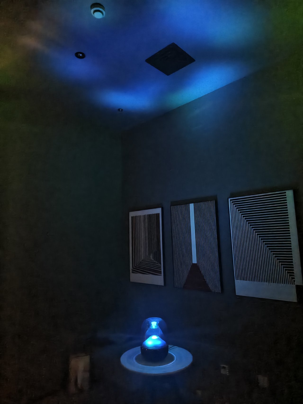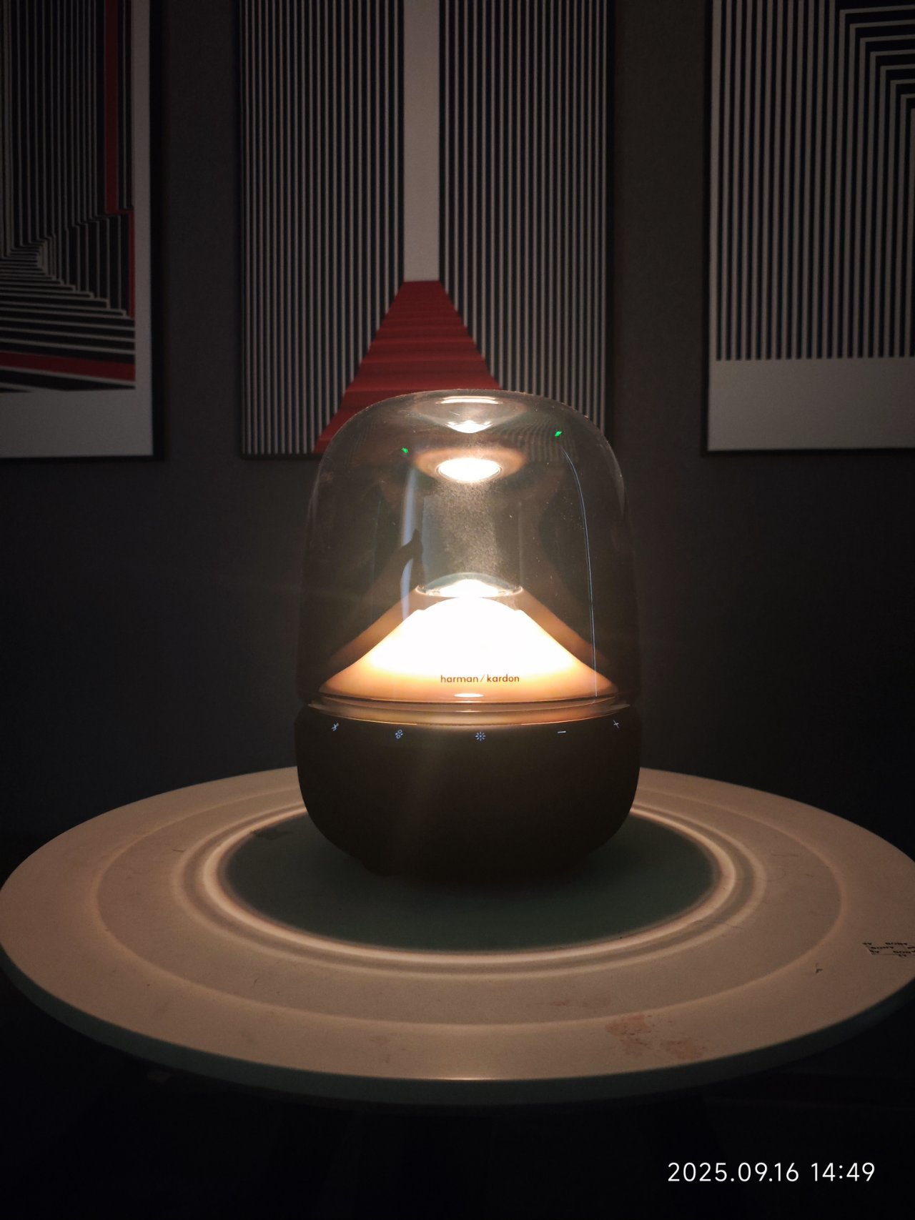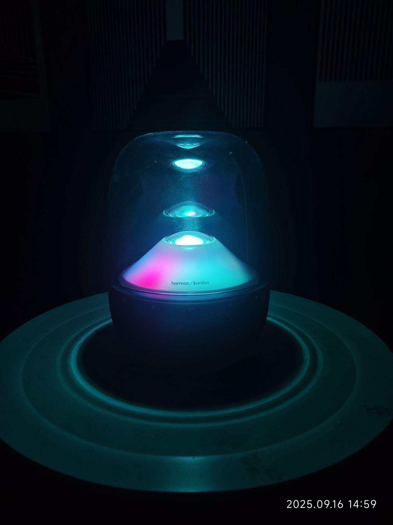 可以看到琉璃4被吐槽的煤氣竈光效變成了富士山光效,此外呢,額外在頂端加入一個可開關的氛圍燈,能投影到天花板上,同時通過玻璃的反射也能投影到音響周圍。