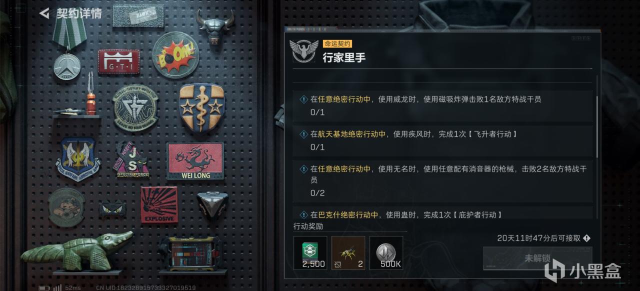 10月8日解鎖,這就是比較享受的任務了,需要使用所有幹員在絕密難度中完成指定任務,讓威龍在絕密用C4擊敗1人和老黑小麪包命中10人,應該是裏邊最難完成的兩項了,純看命了。