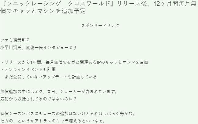 世嘉宣佈將爲《索尼克賽車:交叉世界》提供重磅售後支持,確認玩家在遊戲發售後一整年內將持續獲得免費內容更新。在近期《Fami通》對小林賢和瀧隆一的專訪中透露,本作將每月免費追加一名新角色與一輛新賽車,全年共計12次內容更新。