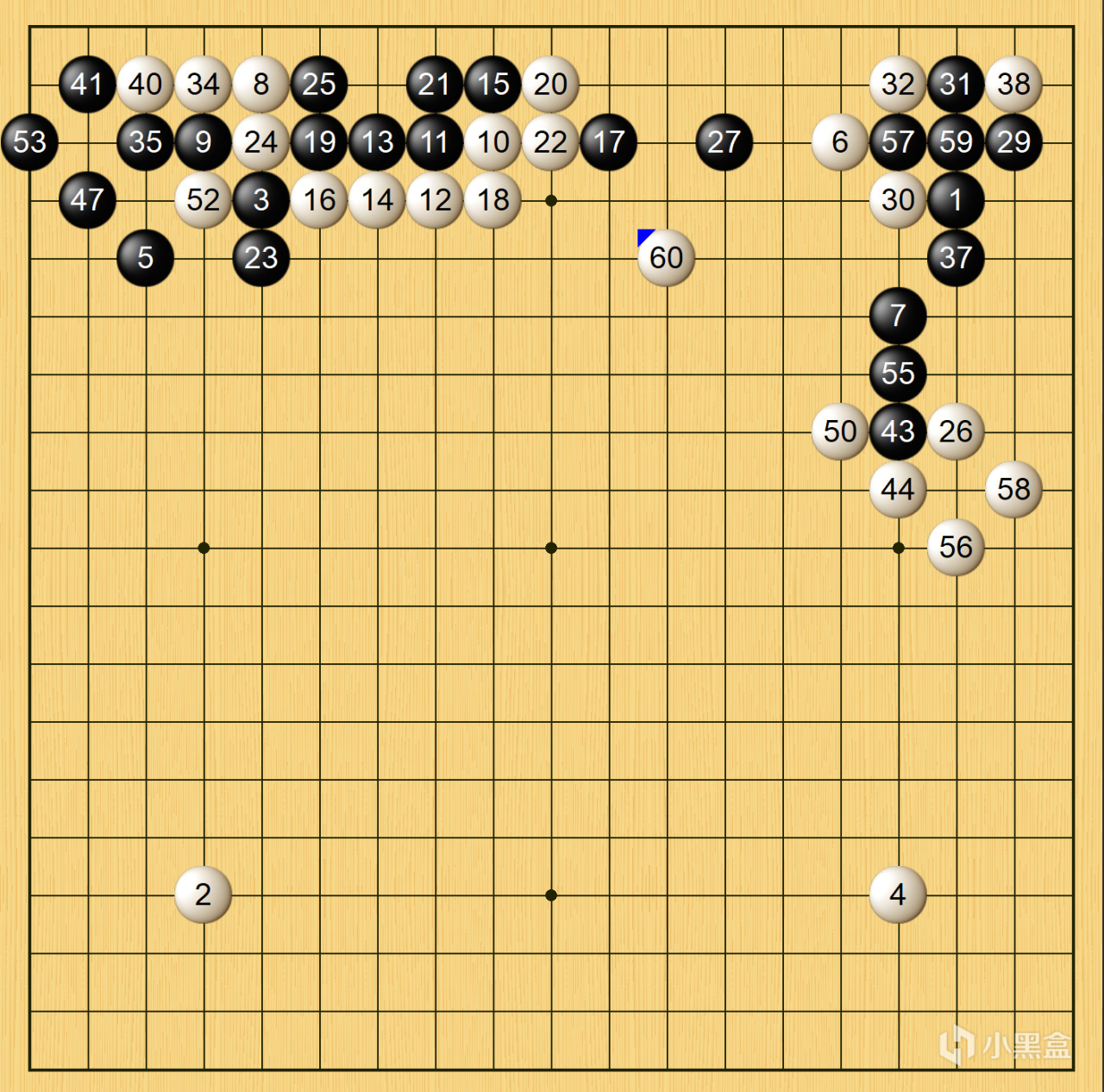 本局柯潔執黑,佈局階段在左上角嘗試了高目守角的新型佈局,